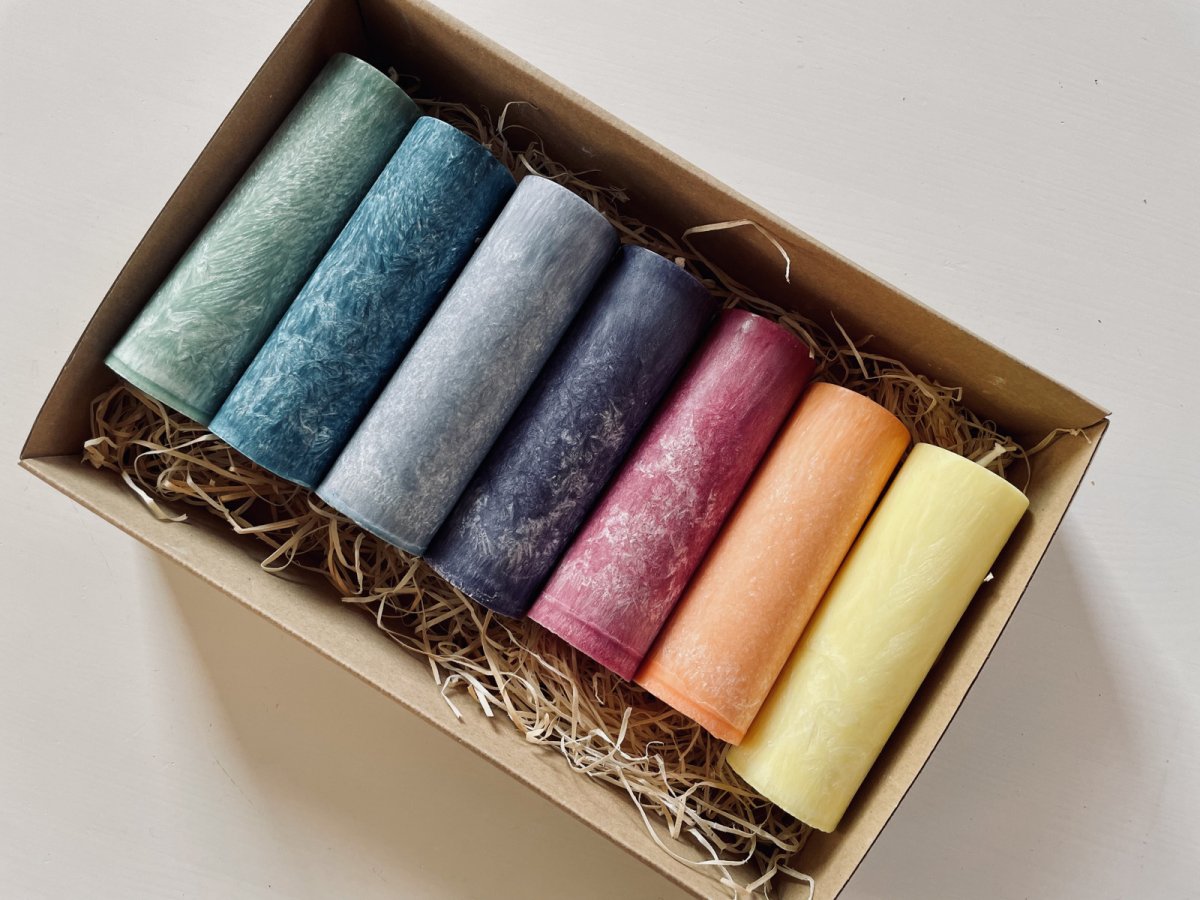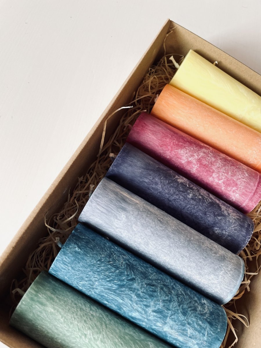 7 čakrových palmových svíček v dárkovém balení o velikosti 12 cm x 3,5 cm.