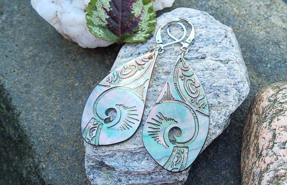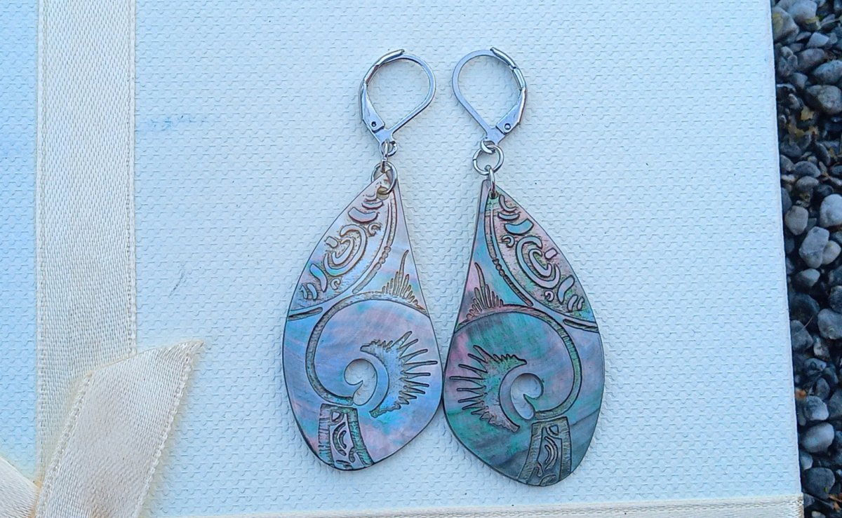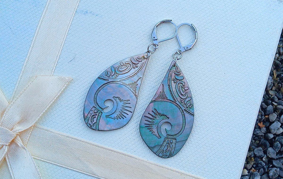 Fantastické opalizující náušnice z Novozélandské perleťoviny, známé jako paua nebo abalone shell vyrobené z velkých plátků perletě ve tvaru kapek cca 45x23 mm s vyřezaným orientálním vzorem na zavíracích háčcích z chirurgické oceli - hypoalergenní, vhodné i pro alergiky.