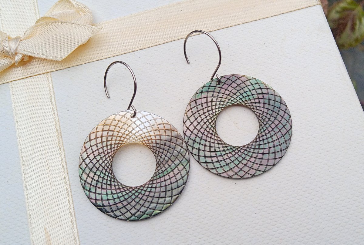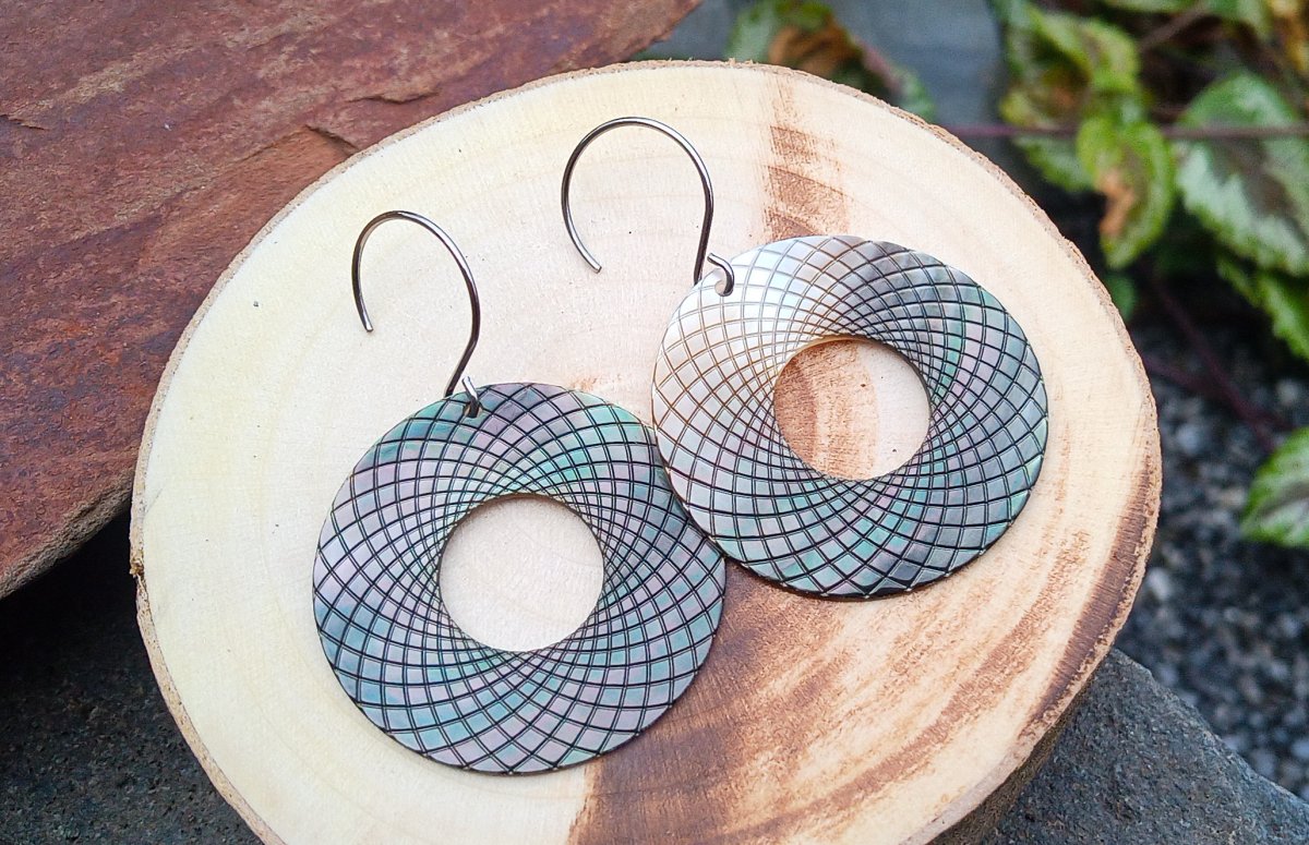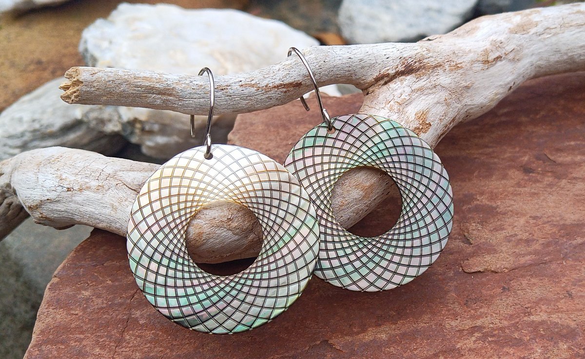 Fantasticky duhové náušnice z Novozélandské perleťoviny, známé jako paua nebo abalone shell ve tvaru kruhů o průměru 3,5 cm s vyřezaným vzorem, kdy ještě více vyniknou perleťově duhové odlesky na půlkruhových háčcích z chirurgické oceli - hypoalergenní, vhodné i pro alergiky.
