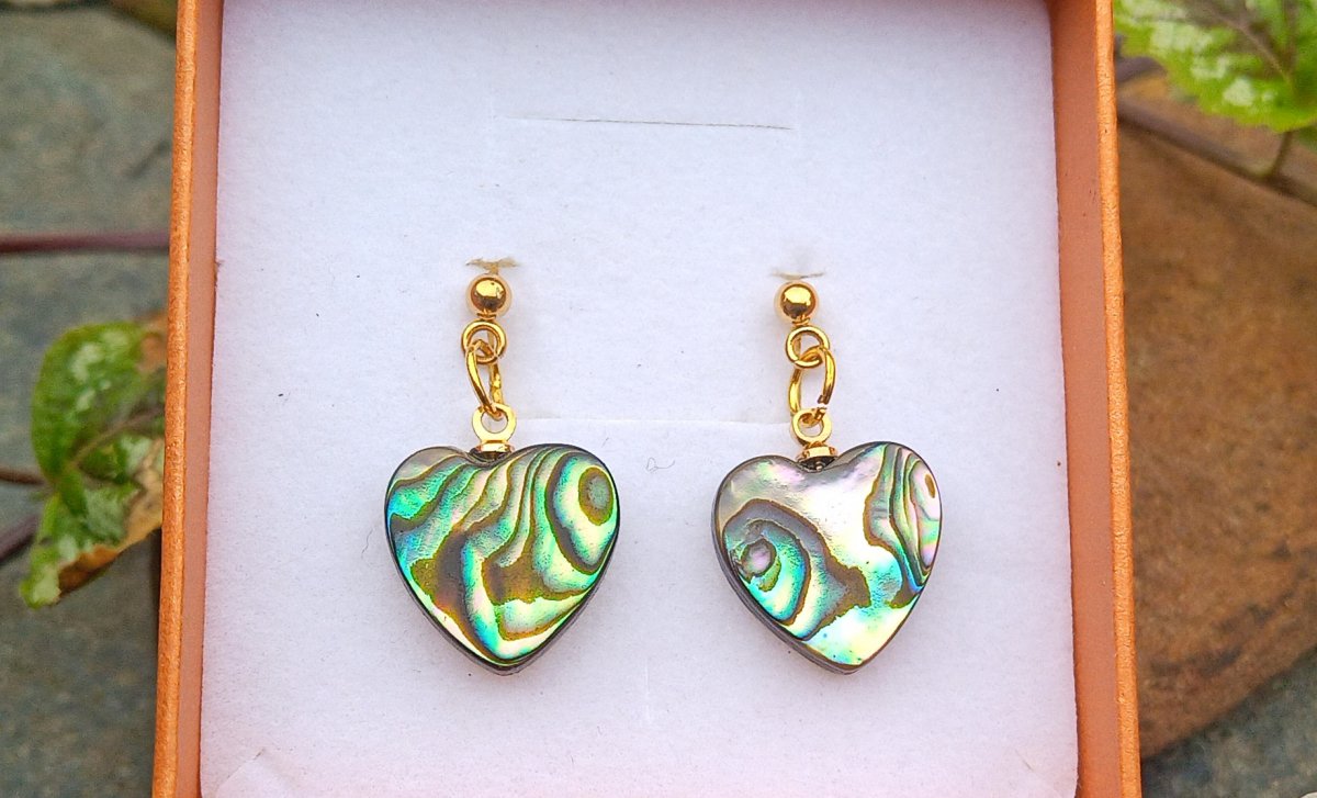 Fantastické opalizující náušnice z Novozélandské perleťoviny, známé jako paua nebo abalone shell ve tvaru srdíček zavěšených pod kuličkami se zapínáním jako puzety v pozlacených náušnicích z chirurgické oceli - vhodné i pro alergiky.