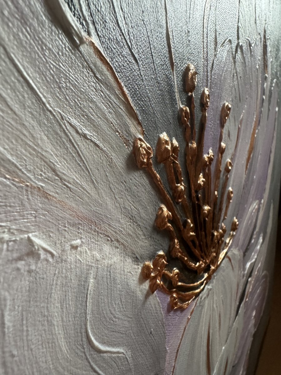 Tento moderní abstraktní obraz květu je vytvořen akrylovými barvami a 3D texturovací pastou, která dodává malbě hloubku a luxusní efekt.