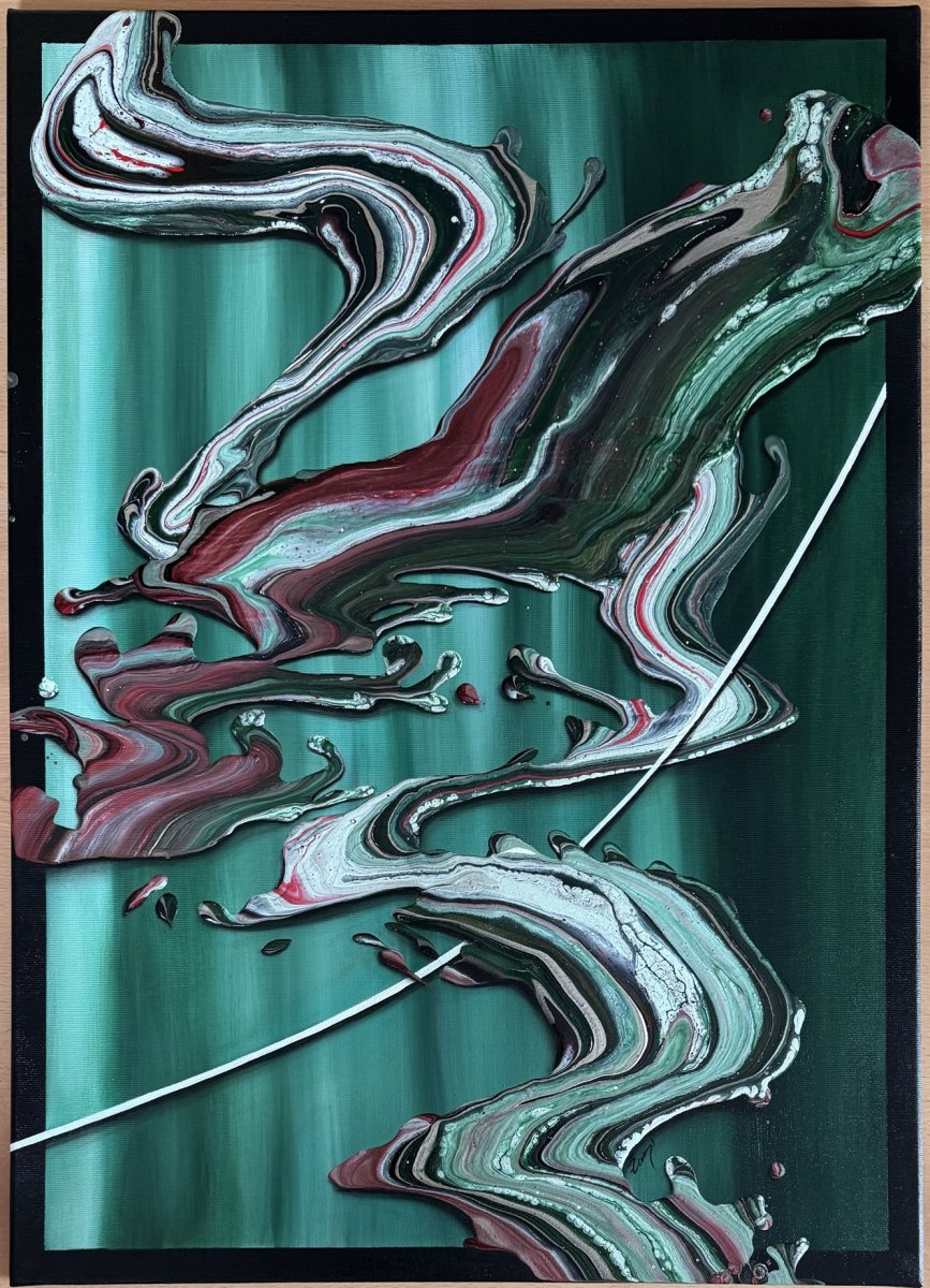 Abstraktní obraz, akryl na plátně, technikou dustpan pouring – způsob, jak nechat energii proudit a dát jí tvar, který už nikdy nikdo nezopakuje.