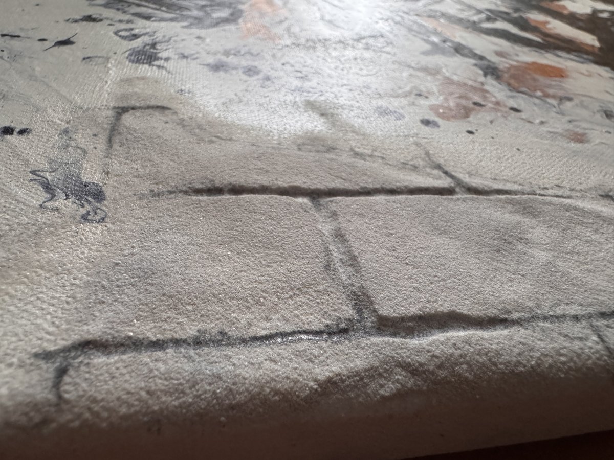 Technika - kombinace akryl pouringu a texturovaného písku. Na malířském plátně.