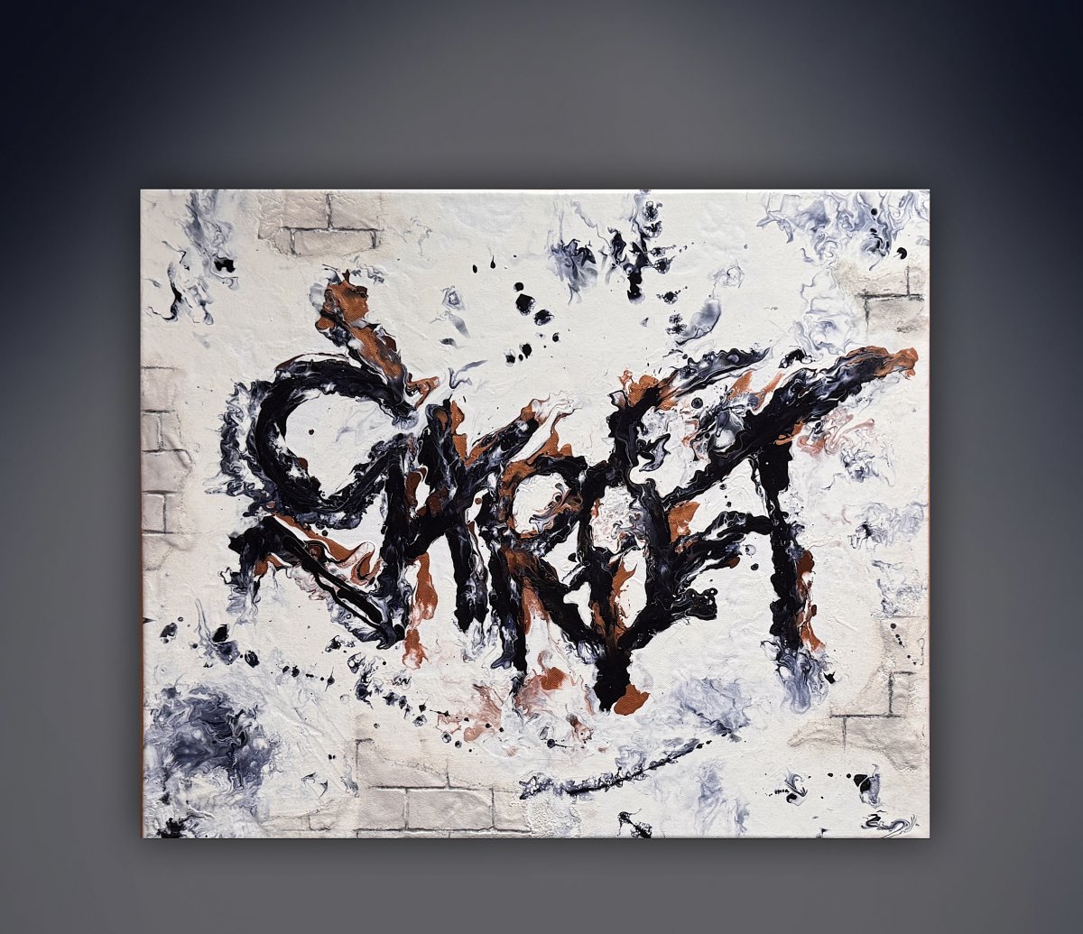 Originální kombinace street-artu a abstraktní malby technikou pouring. Na první pohled evokuje graffiti, expresivně, výbušně, s dynamikou připomínající sprej na stěně.