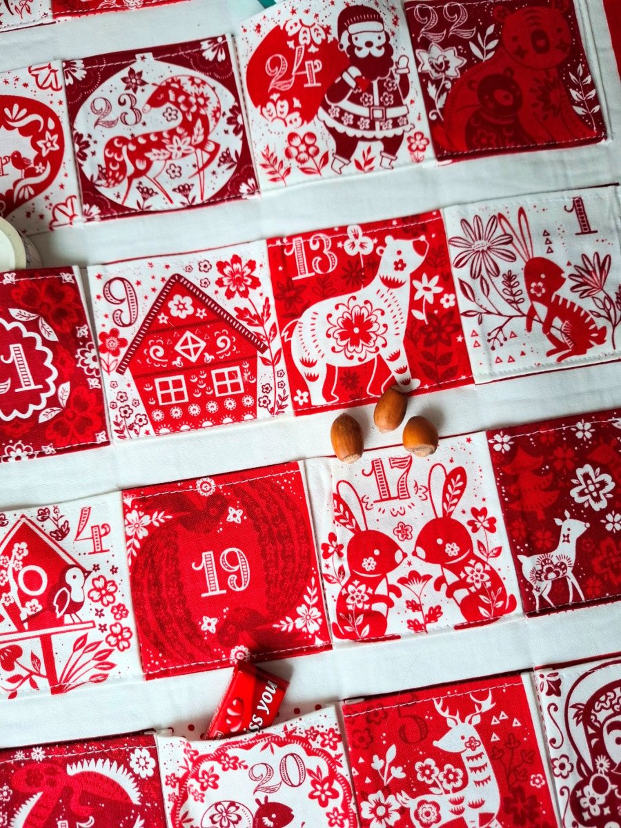 Textilní adventní kalendář se zimními motivy v klasické bílo červené barevnosti.