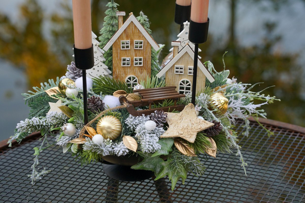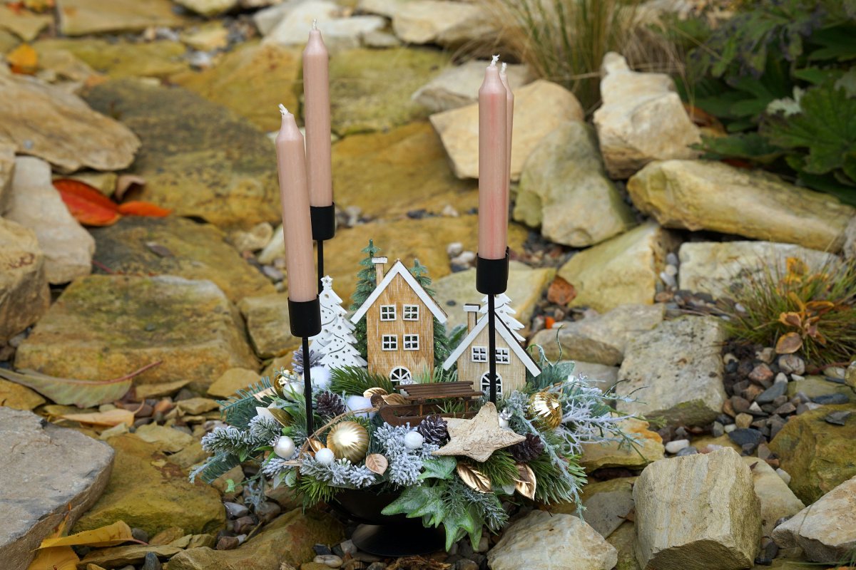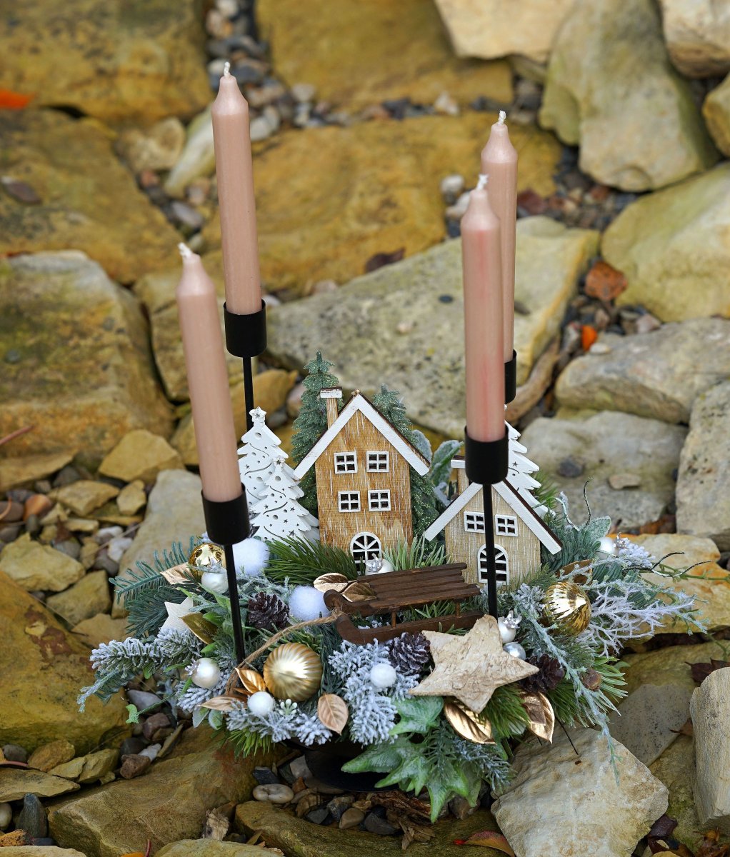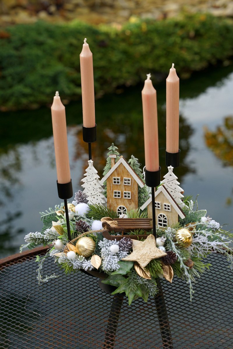 Elegantní adventní svícen s umělým chvojím ve 3D kvalitě, domečky, baňkami a dalšími přizdobami.