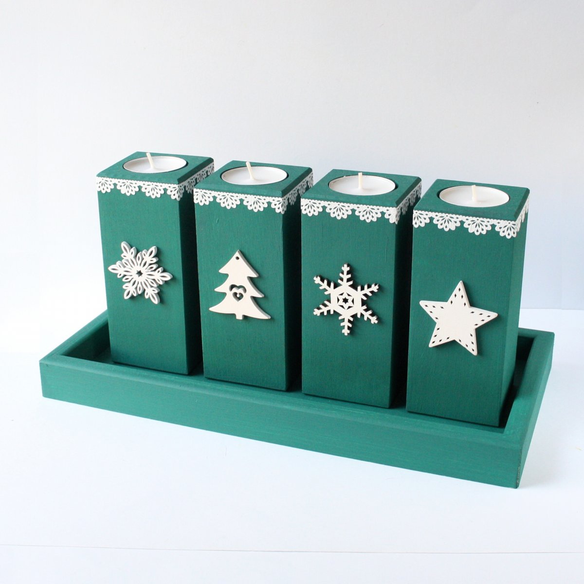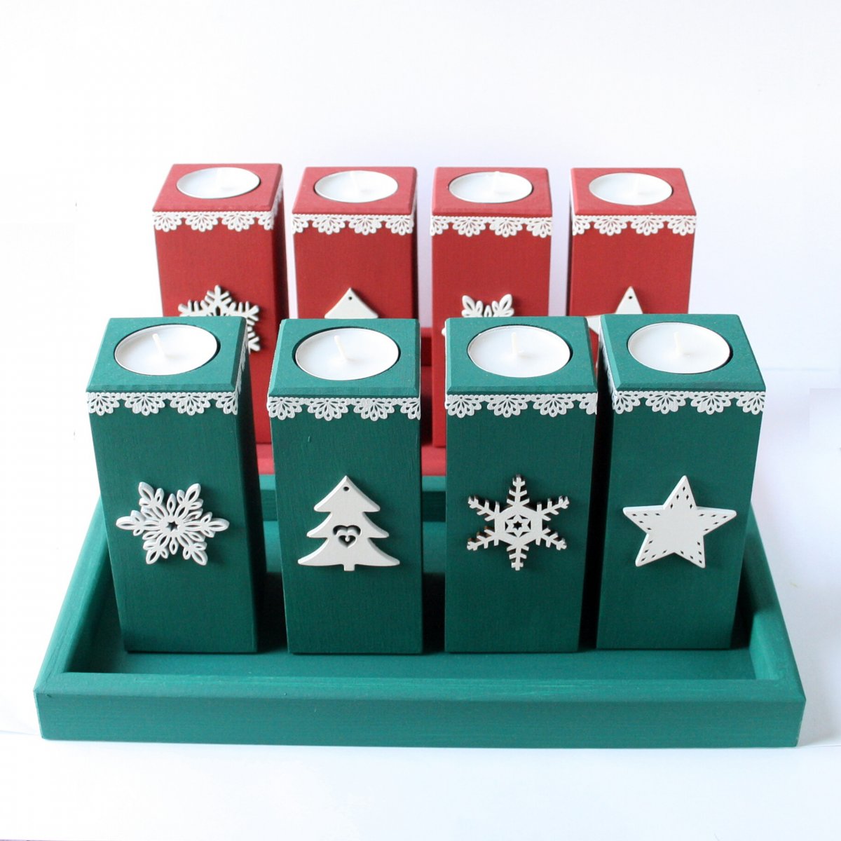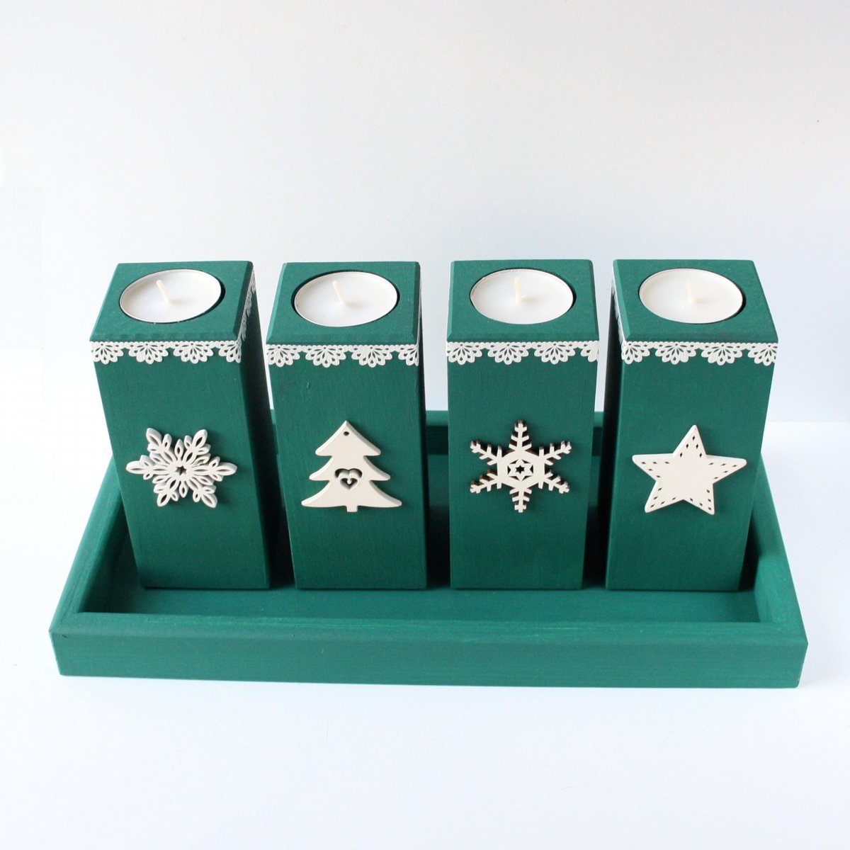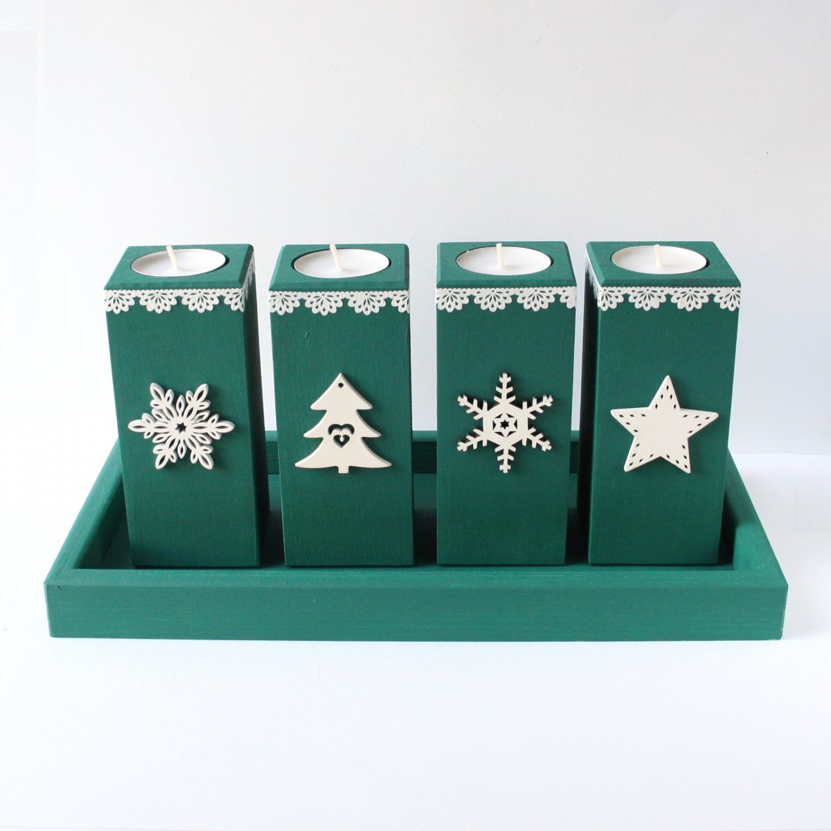 Sada svícnů z masivního dřeva dekorovaná krajkou a vánočními výřezy. Svícny jsou postavené na dřevěném tácku stejné barvy.