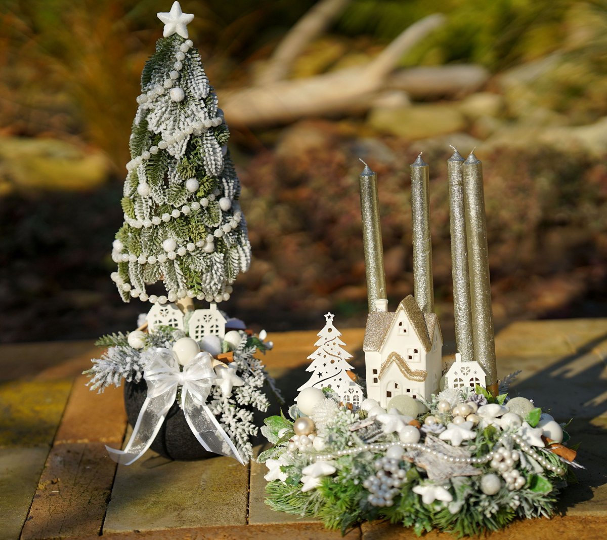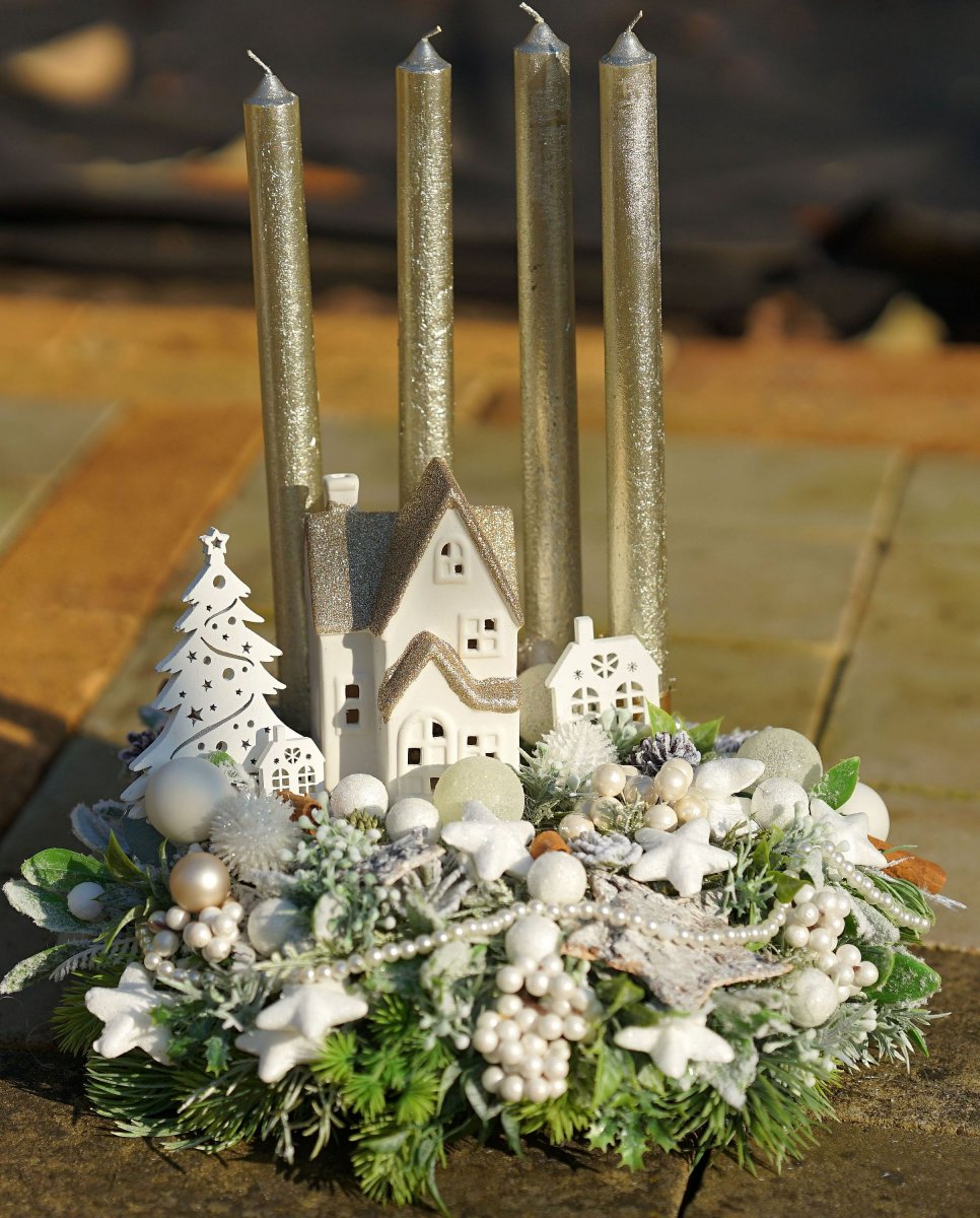 Elegantní advenení svícen z umělého kvalitního chvoji, s domečkem. V nabídce najdete ručně vyráběný stromeček ve stejném stylu.