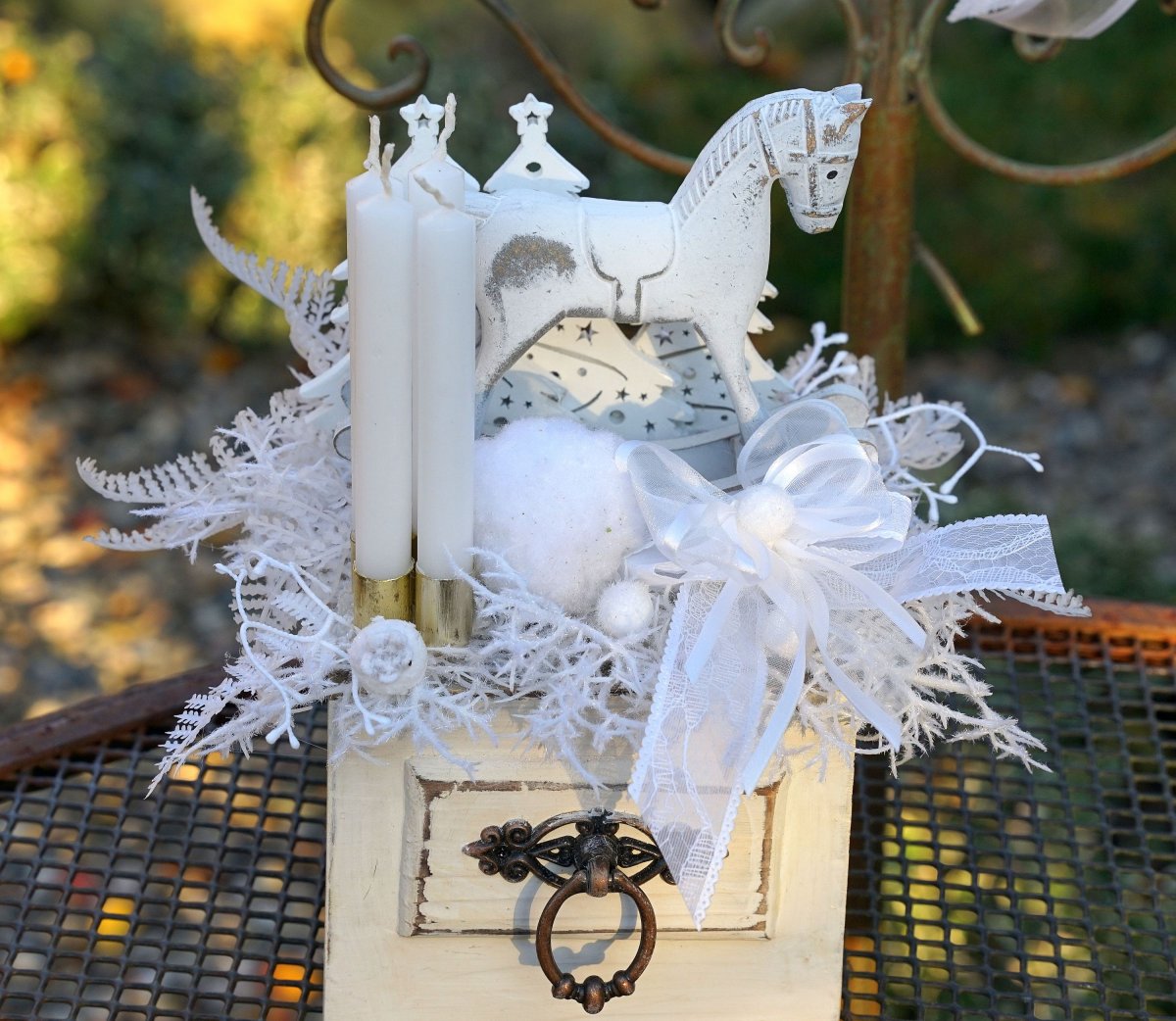 Adventní svícen v dřevěném šuplíčku v bílé barvě. Rozměr svícnu je 23x20x22cm