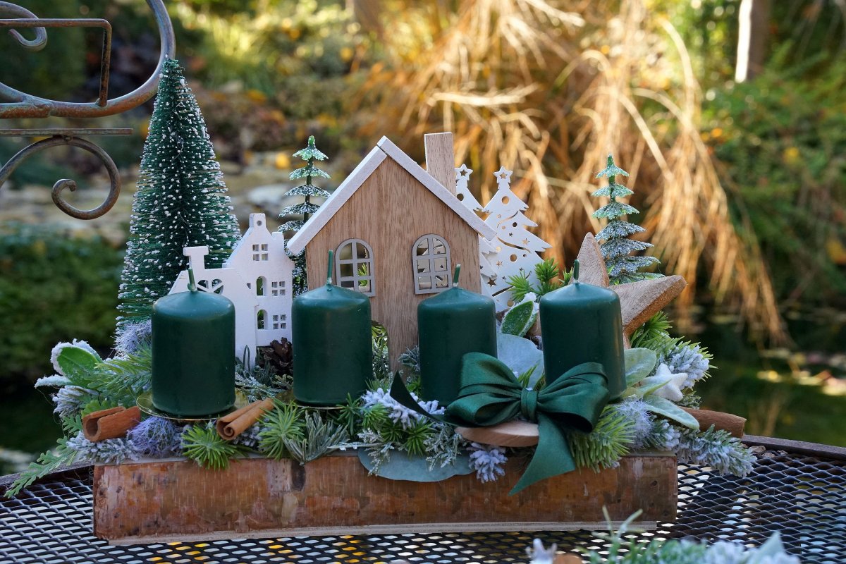 Adventní svícen dlouhého tvaru v dřěvěné krabičce. Rozměr 32x19x21cm. Stromečky, dřevěné domečky, hvězda a další přízdoby.