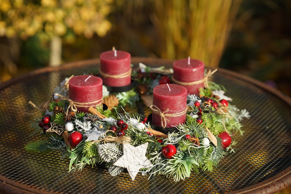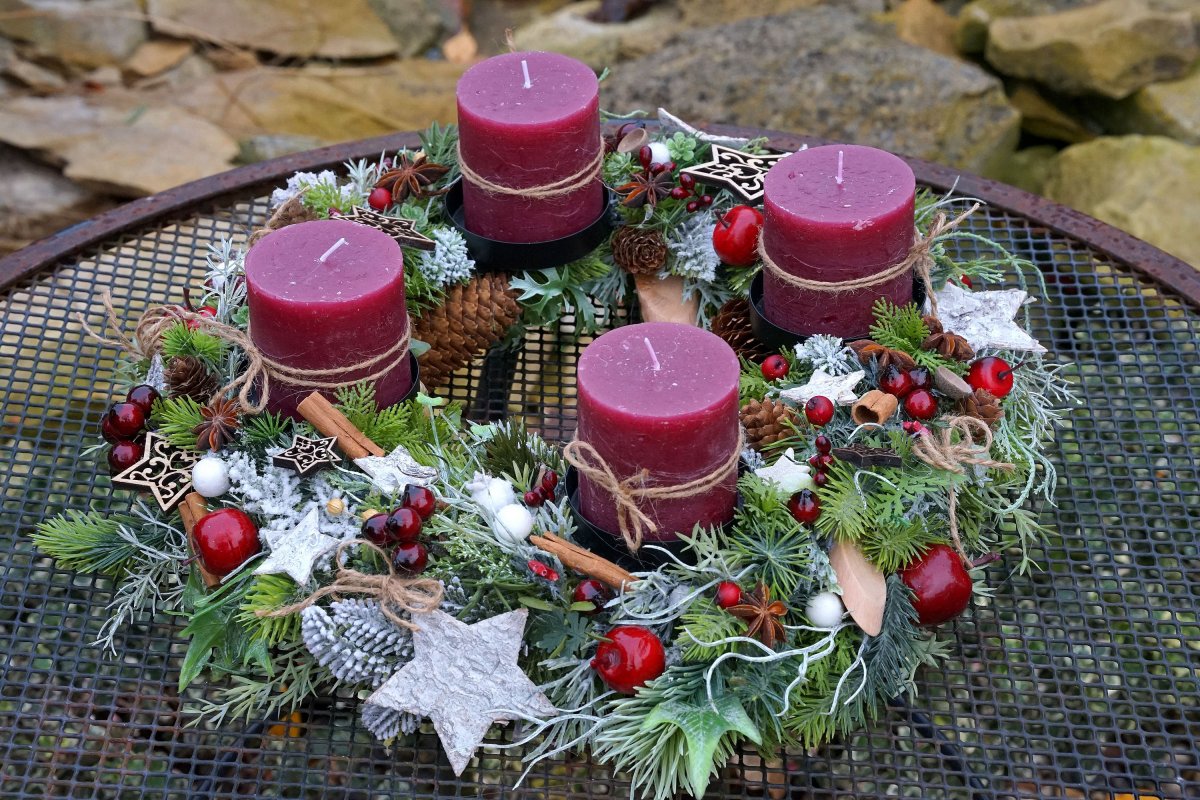 Adventní věnec v bordó barvě, umístěný na kovovém základu. Umělé chvojí ve 3D kvalitě, hvězdičky z kůry, jablíčka, dřevěné doplňky, skořice, limetky a další materiál.