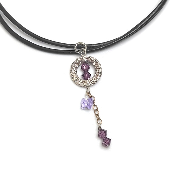 Jako kapka soumraku zachycená do stříbra... tak působí náhrdelník Fialový Měsíční kruh, ve kterém se setkává romantika noci s něžným třpytem krystalů Swarovski. Stříbrný ornamentální prstenec připomíná bránu do snového světa, kde se barvy soumraku mění v malé křišťálové hvězdy.