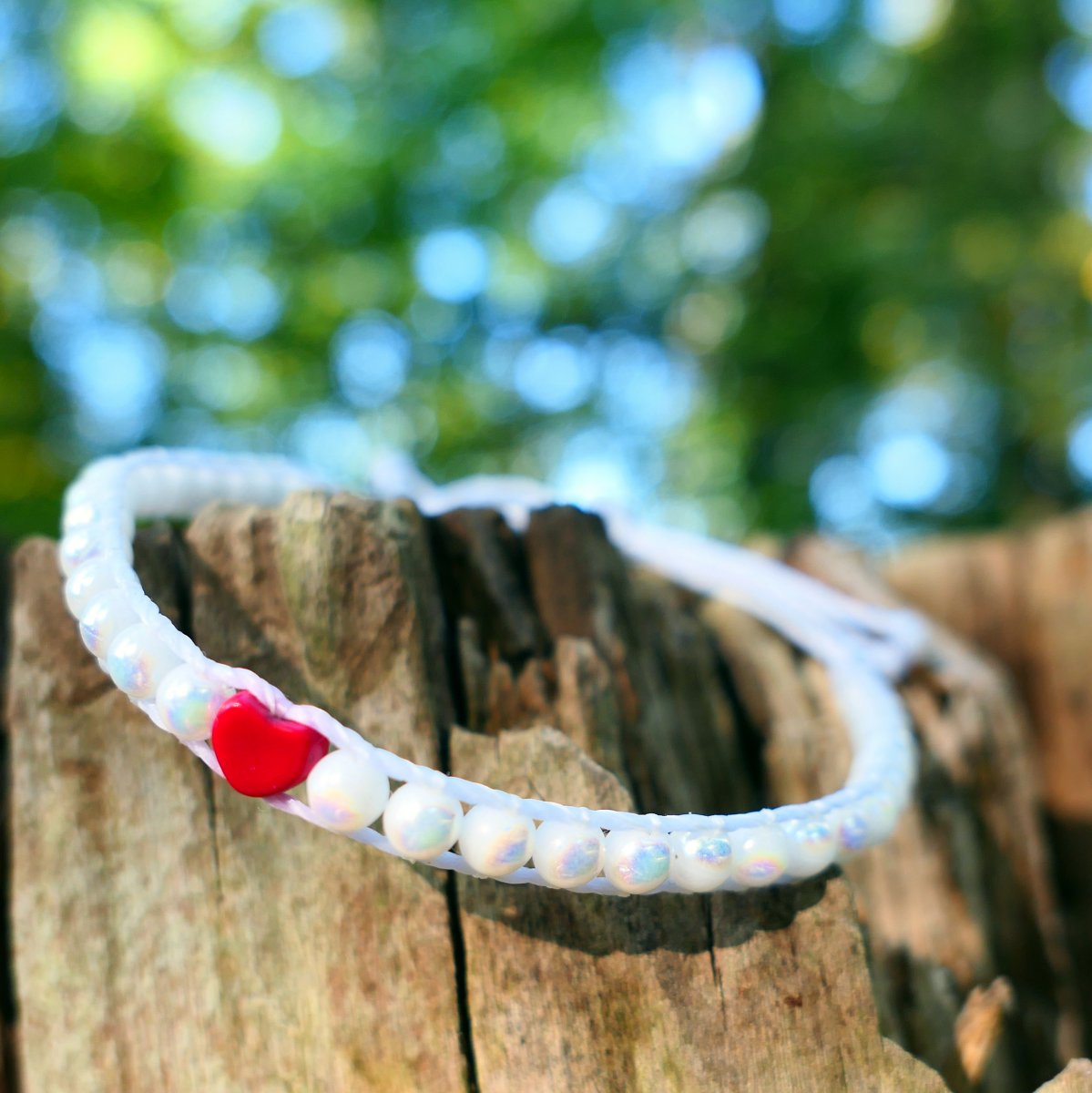 Úzký náramek s mačkanými kulatými korálky v bílé barvě, částečný pokov AB. Korálky jsou vetkány mezi kvalitní voskovanou šňůrku Linhasita bílé barvy, uprostřed korálek ve tvaru srdce, zapínání na posuvný uzlík. Šňůrky ukončeny uzlíky.