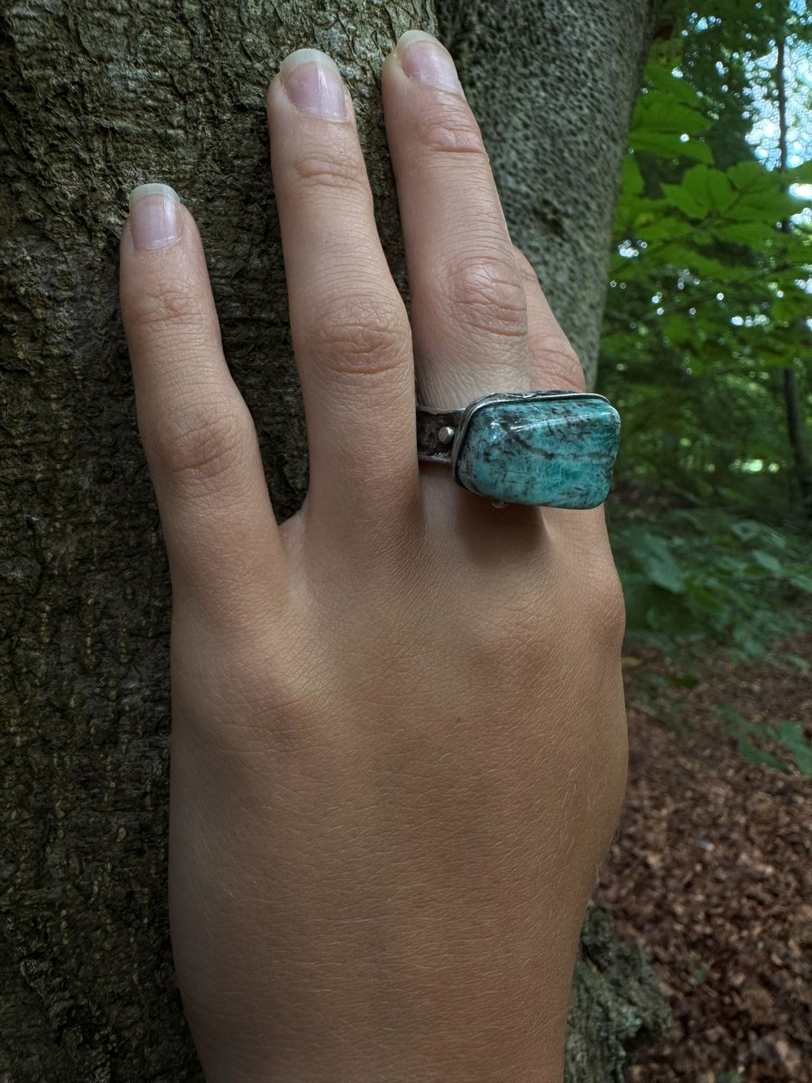 Prstýnek s kamenem AMAZONIT. Výrazná zelená barva a přitom stále působí na ruce jemně.