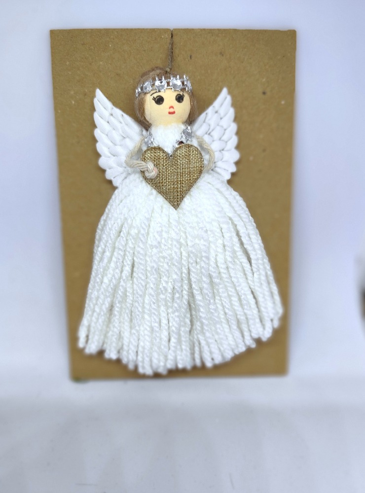 Krásná ručně vázaná macramé andělka s možností zavěšení. Elegantní design doplňují křídla a jemné detaily.