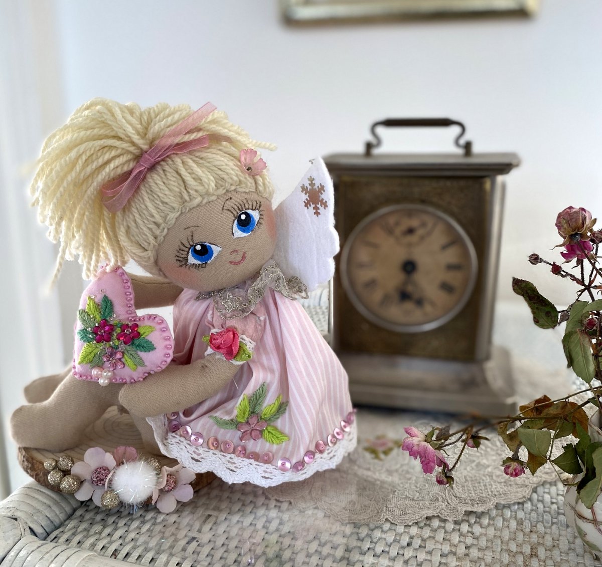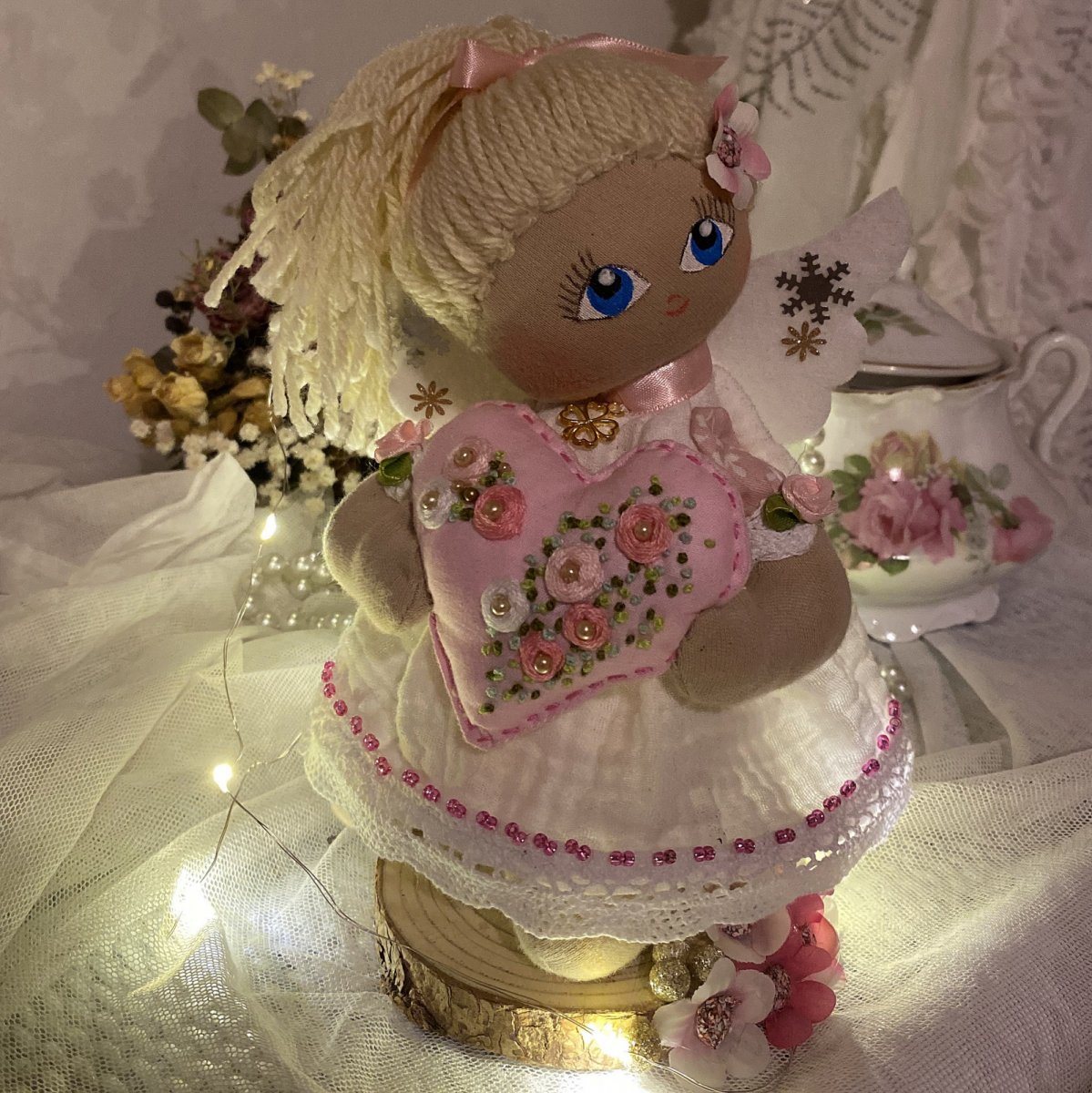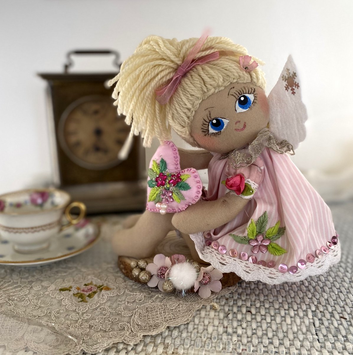 Andělka je ušita z bavlněného úpletu, obličejík ručně malovaný, vyšívané srdíčko drží v ručičkách.