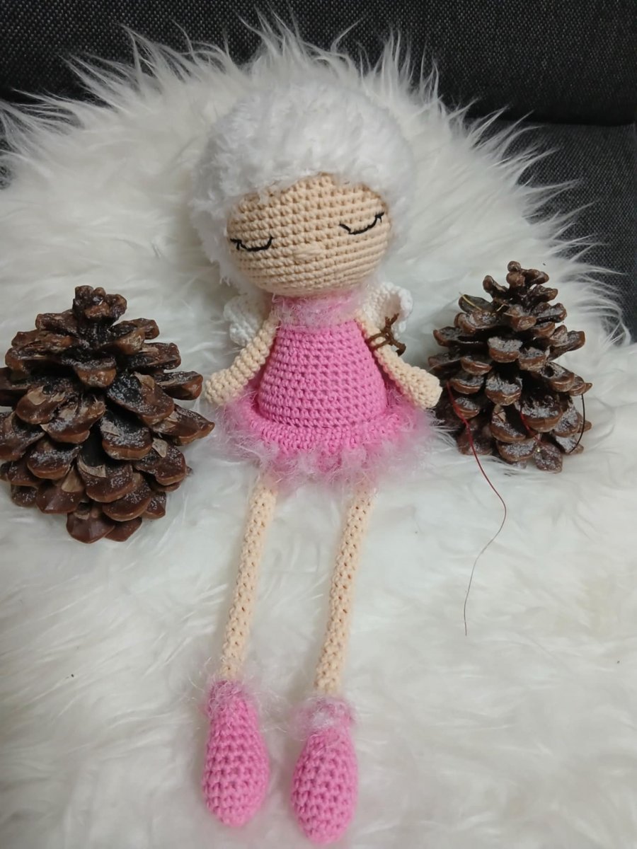 Háčkováno ze směsové příze bavna/akryl a vlásky z chlupaté příze polyamid), naplněné dutým vláknem.