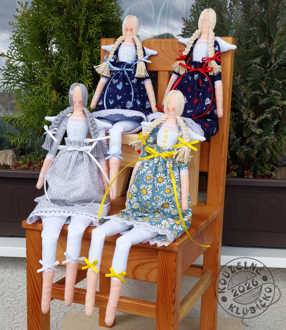 Panenka - andělka - dekorace ušitá ze 100% bavlněné látky, sukýnka šedý základ se vzorkem bílých kvítků, (k dispozici mám různé látky, napište svou představu a domluvíme se), plněná dutým vláknem, zdobená bavlněnými krajkami, saténovými kytičkami, stužkami, vlásky z bavlněné příze, očka malovaná barvou na textil. Panenku lze posadit s oporou, případně zavěsit.