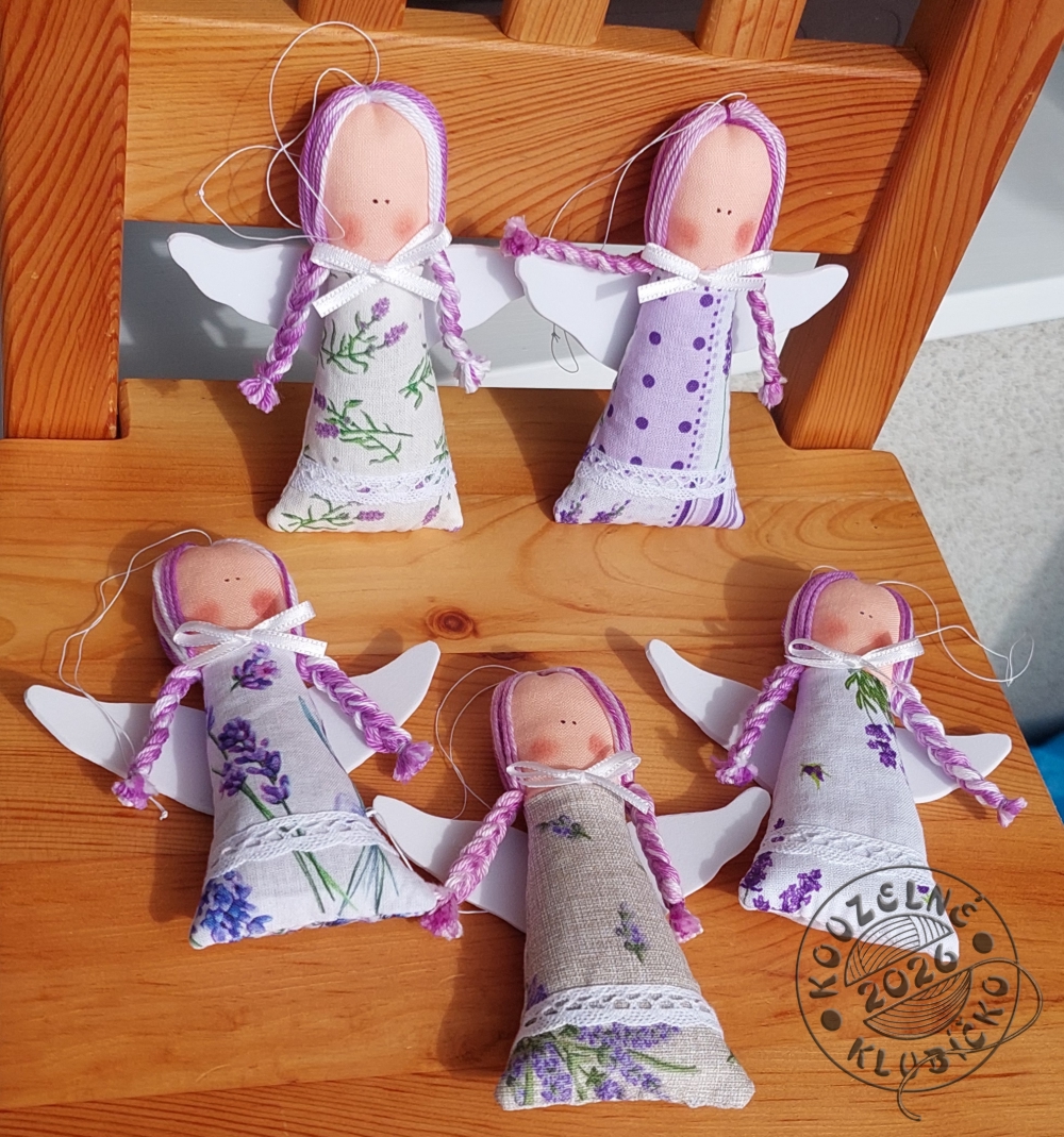 Voňavé MINI andělky/voničky ušité z krásné bavlněné látky, bílý základ se vzorem levandule, vlásky z melírované bavlněné příze ve fialových odstínech, zdobené krajkou a mašličkou, křidélka z pěnového papíru/moonsgummi, opatřené poutkem k zavěšení, plněné sušeným květem levandule lékařské a dutým vláknem. Dutým vláknem je plněná jen hlavička, tělíčko plněné pouze levandulí!