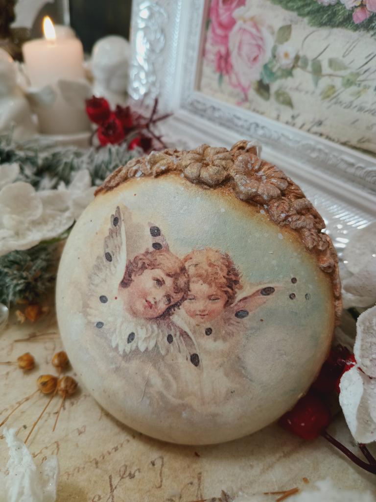 Vánoční ozdoba ve tveru medailonu s motivem andělů. Po obvodu je medailon zdobený jednoduše a pod očkem je vytvořená květinová bordura. Ozdoba je lehce patinovaná do vintage stylu.