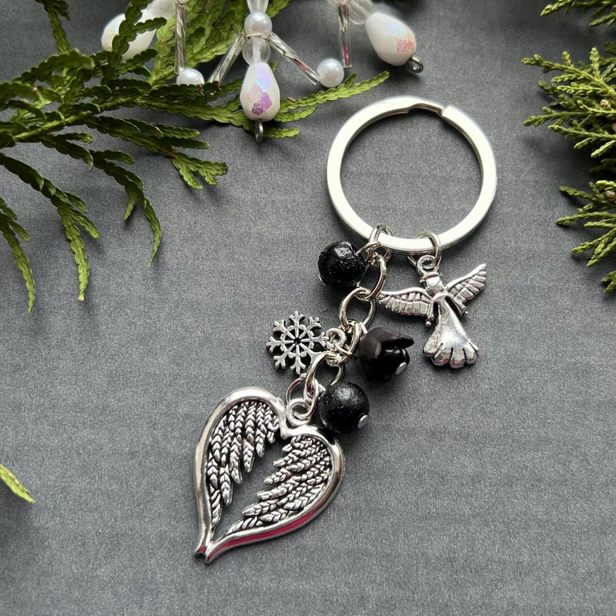 Střapec - přívěsek na kabelku, na bat'ůžek, na mobil nebo na klíče s andělkou, vločkou, andělskými křídly a korálky na kroužku s řetízkem. Délka včetně kroužku 9 cm, kroužek 3 cm