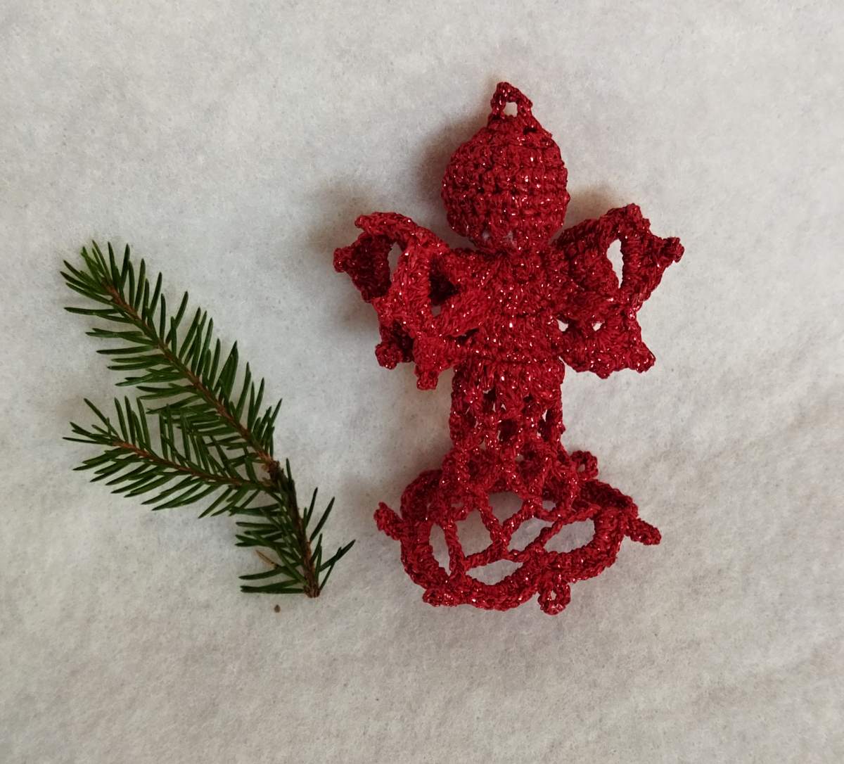 Andílek je uháčkovaný z vysoce kvalitní metalizované červené efektní příze německé výroby. Je pečlivě naškrobený, aby krásně držel tvar. Jeho výška je cca 9cm. Skvěle se hodí jako ozdoba na vánoční stromeček, věnec nebo jako přízdoba k dárkům. Nebo ho můžeme postavit volně na vánoční stůl nebo okno. Fantazii se meze nekladou.