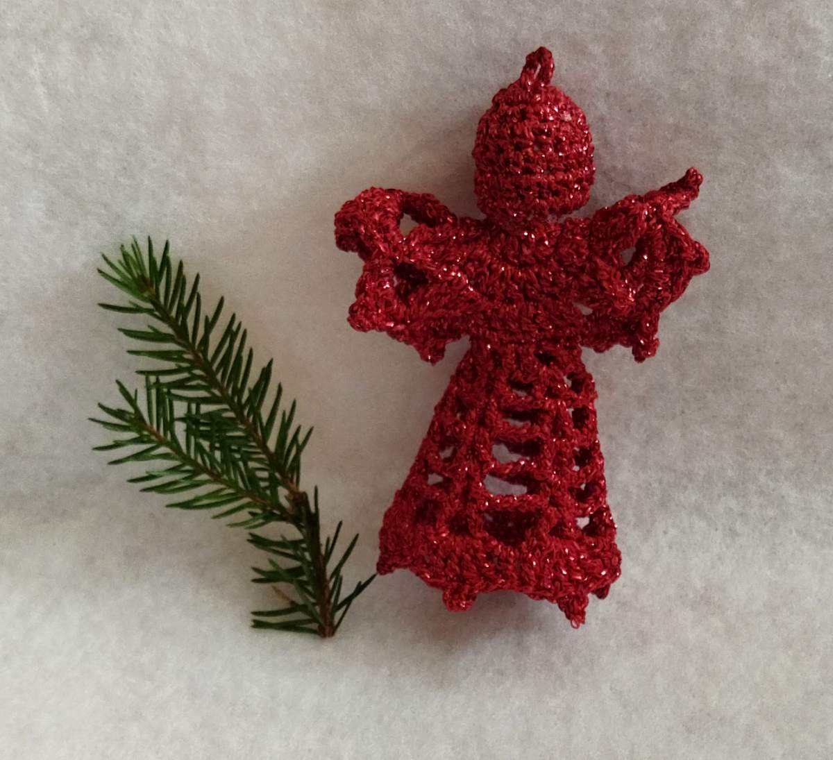 Andílek je uháčkovaný z vysoce kvalitní metalizované červené efektní příze německé výroby. Je pečlivě naškrobený, aby krásně držel tvar. Jeho výška je cca 9cm. Skvěle se hodí jako ozdoba na vánoční stromeček, věnec nebo jako přízdoba k dárkům. Nebo ho můžeme postavit volně na vánoční stůl nebo okno. Fantazii se meze nekladou.