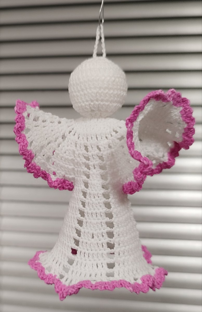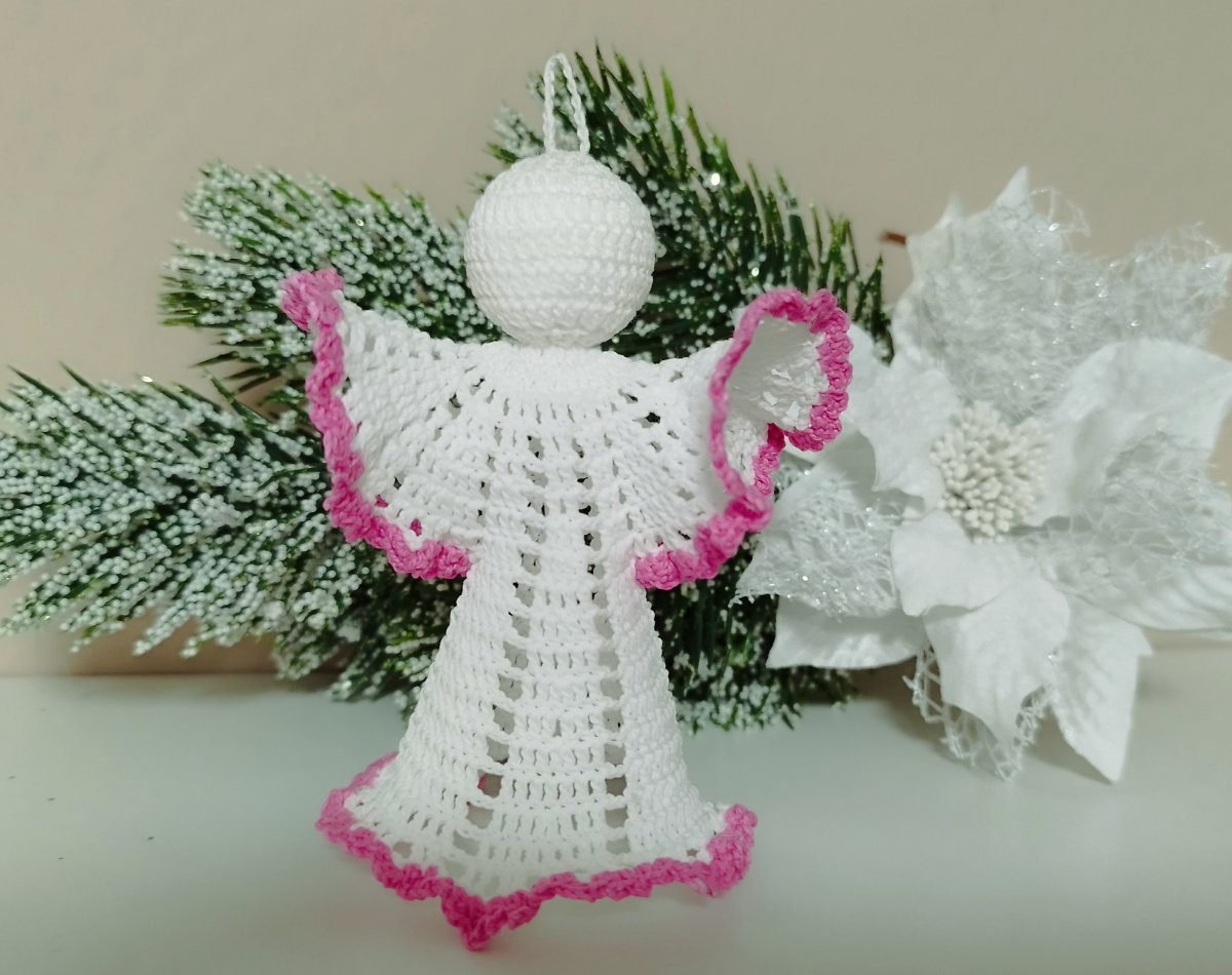 Ručně háčkovaný andílek, bílá barva, tmavě růžový lem,