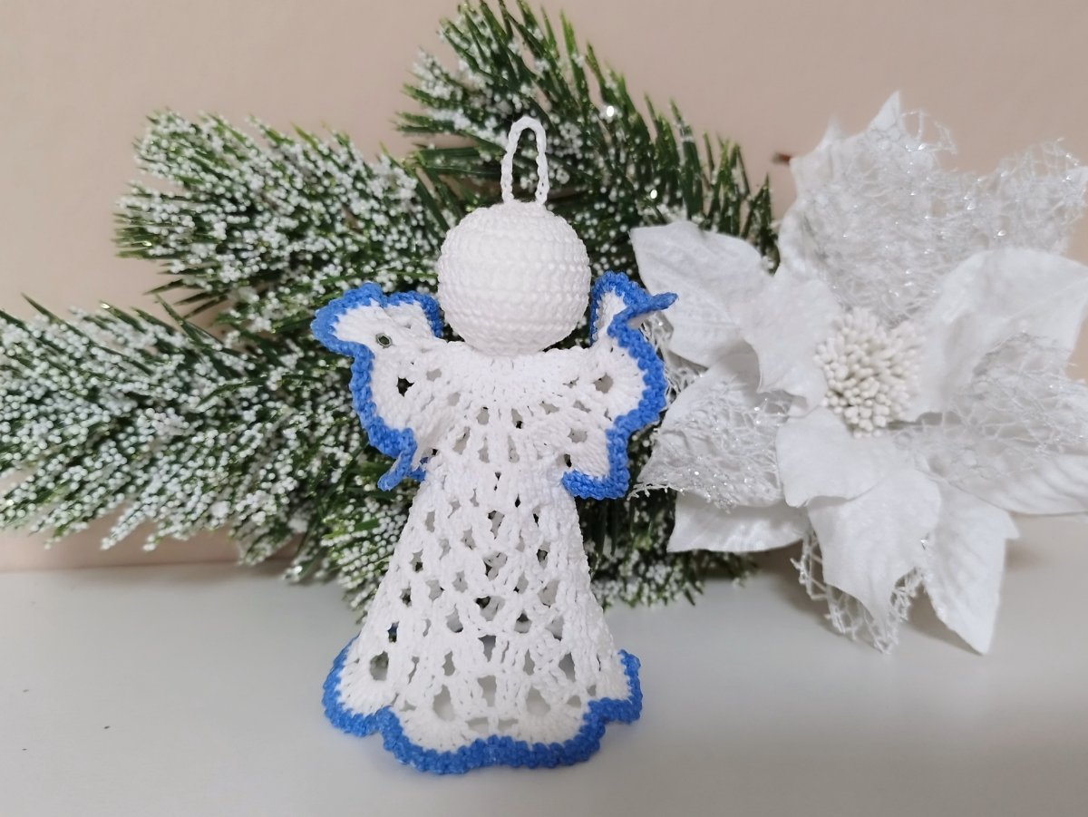 Ručně háčkovaný andílek, bílá barva, modrý lem,