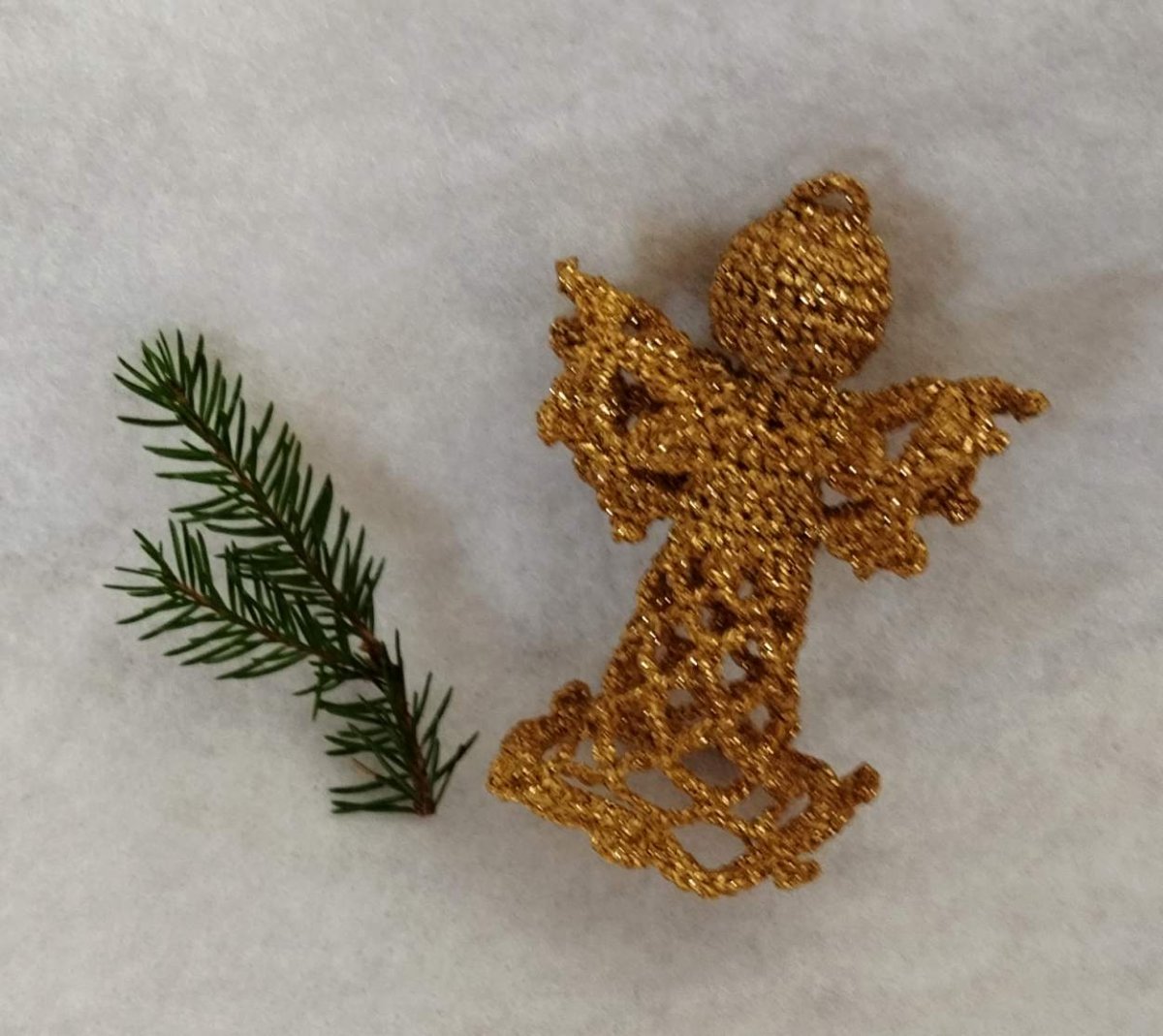 Andílek je uháčkovaný z vysoce kvalitní metalizované zlaté efektní příze německé výroby. Je pečlivě naškrobený, aby krásně držel tvar. Jeho výška je cca 9cm. Skvěle se hodí jako ozdoba na vánoční stromeček, věnec nebo jako přízdoba k dárkům. Nebo ho můžeme postavit volně na vánoční stůl nebo okno. Fantazii se meze nekladou.