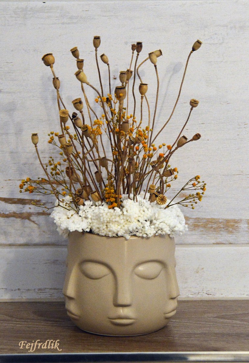 Originální aranžmá v keramické ,,hlavě- obličej ze všech stran ;-), se stabilizovanou bělenou Achilleou , sušenými makovičkami a stabilizovanou Gypsophilou.