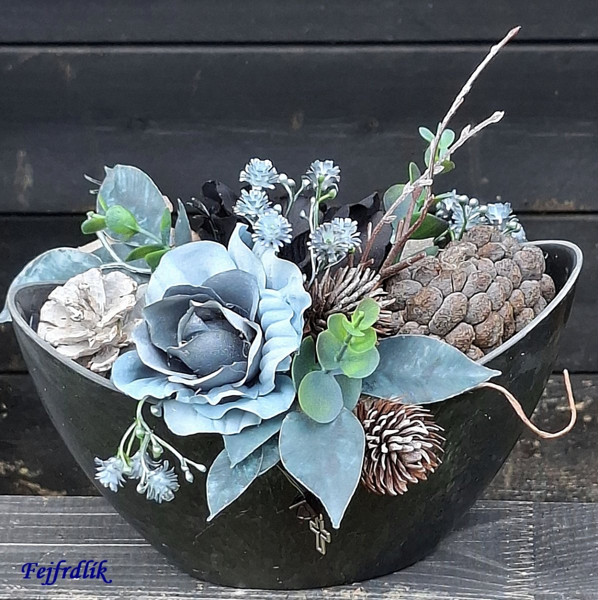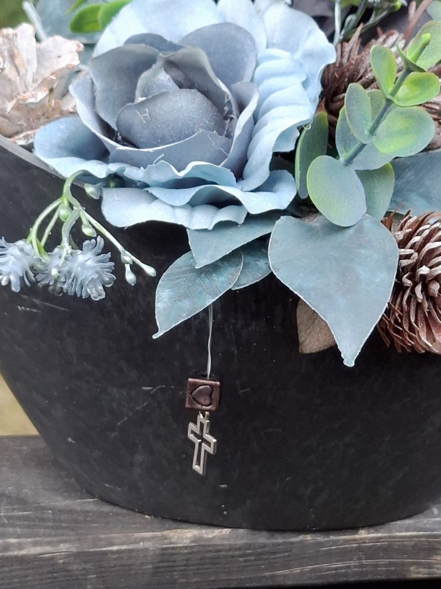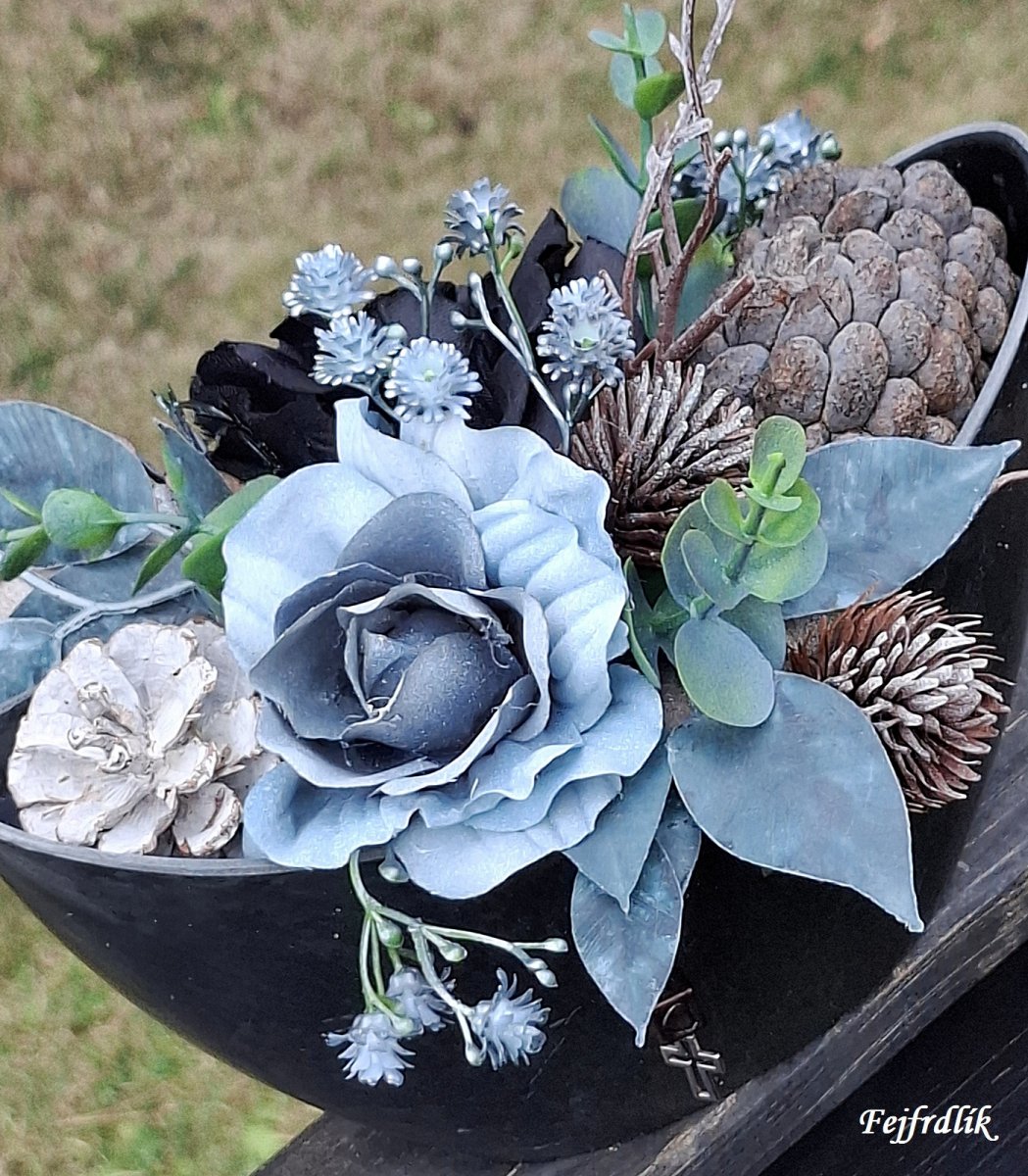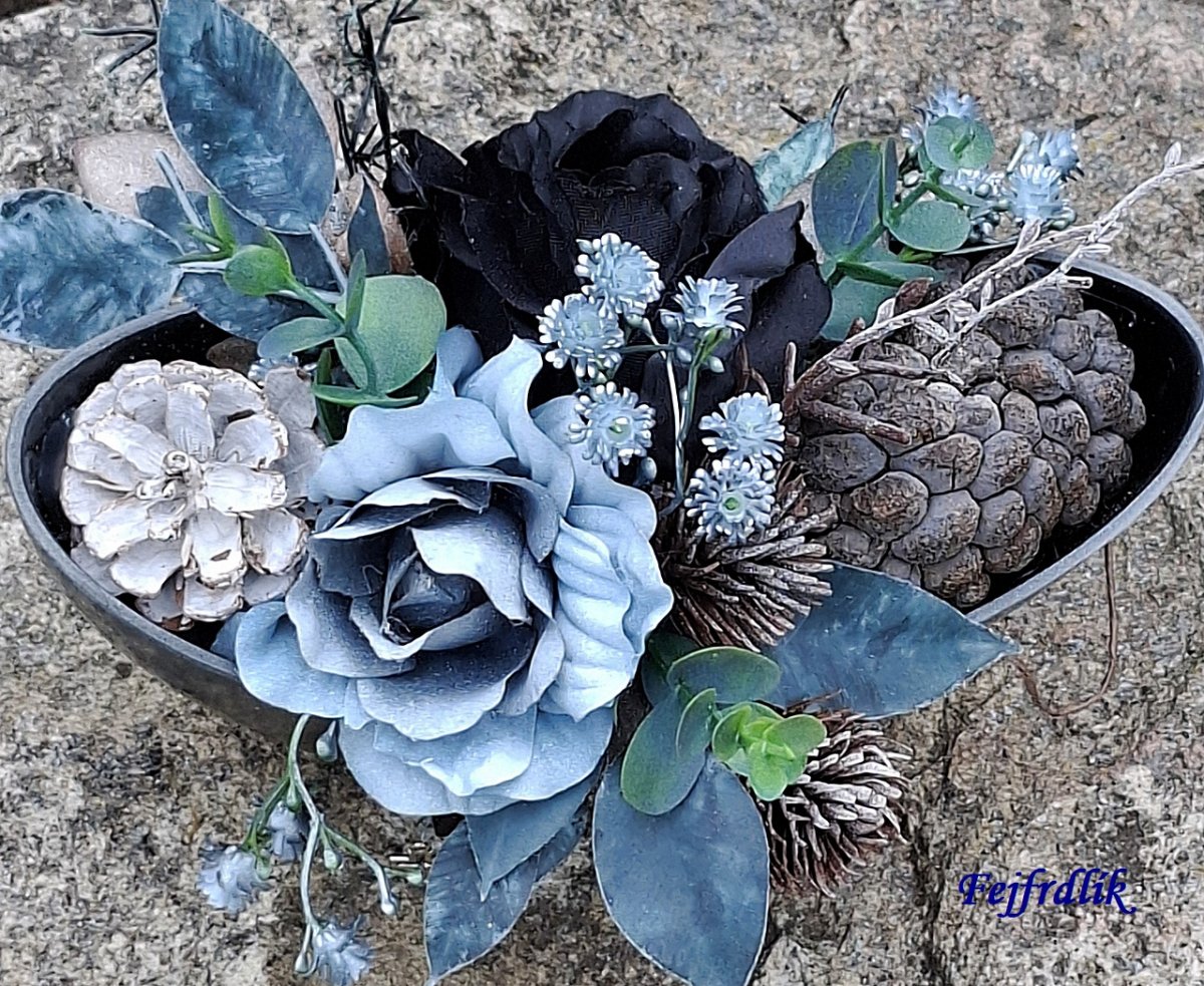 Hřbitovní dekorace v oválném obalu antracitové barvy (tvrdší plast) s umělou černou růží, modrou růží, šiškou .. se zavšeným malinkým kovovým křížkem.