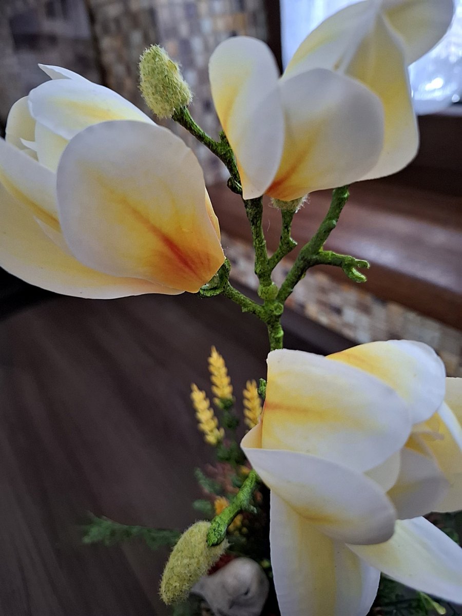Originální aranžmá s keramickým (polyresin) ptáčkem, krásnou umělou magnolií, zelení, vřesem v keramickém obalu.