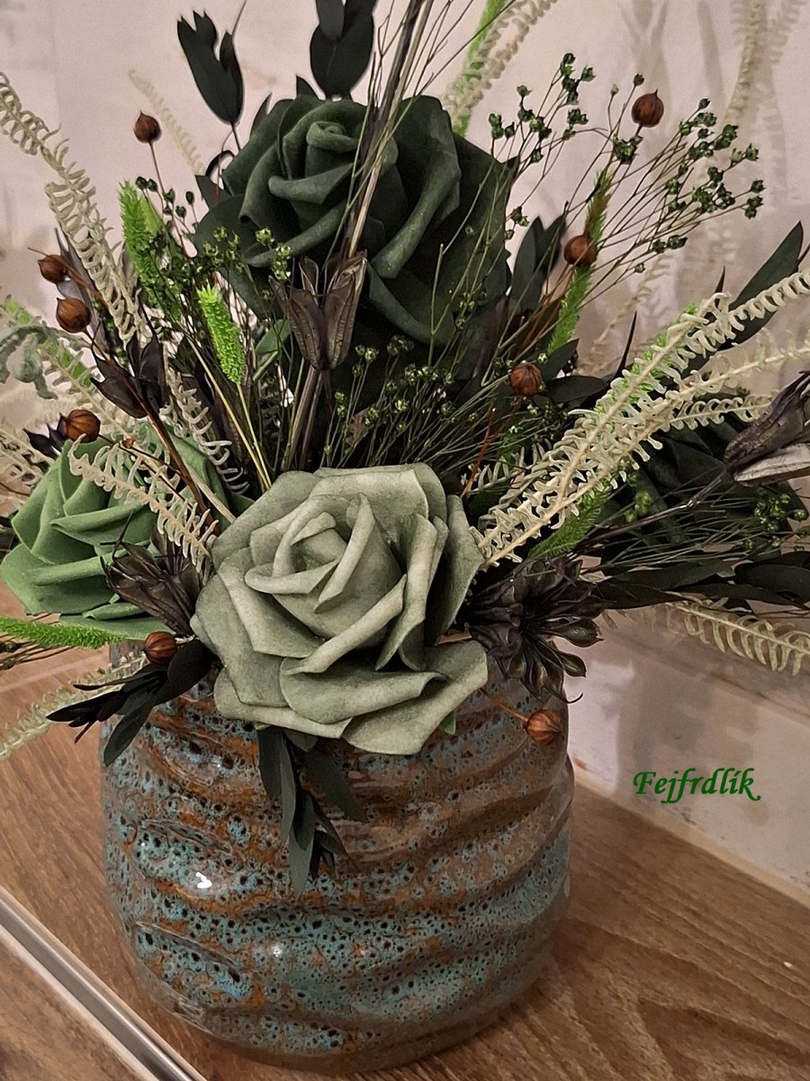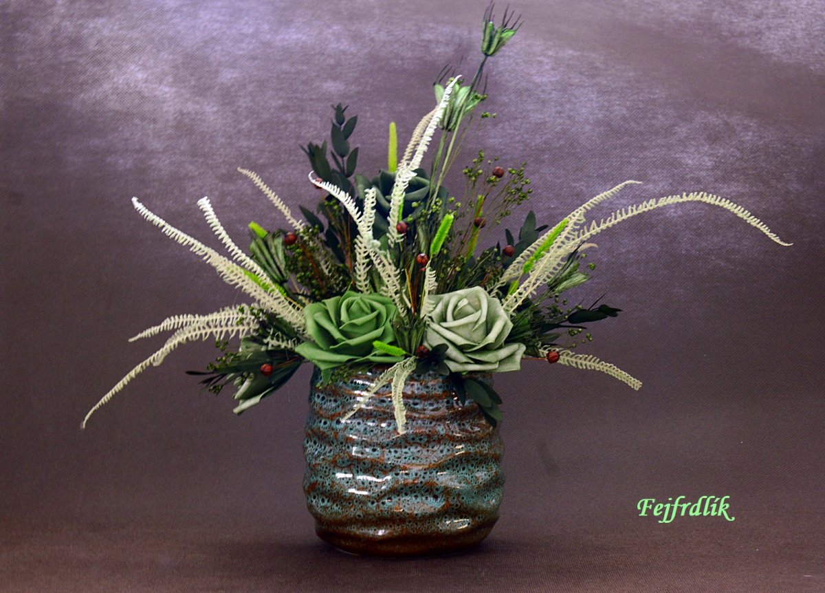 Originální aranžmá v keramickém zdobeném obalu se stabilizovanou a ost. sušinou a pěnovými růžemi.