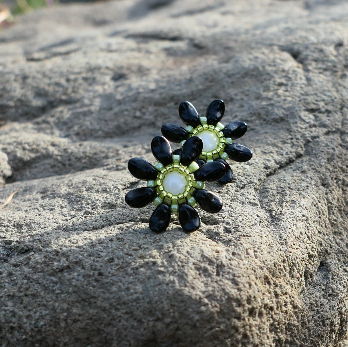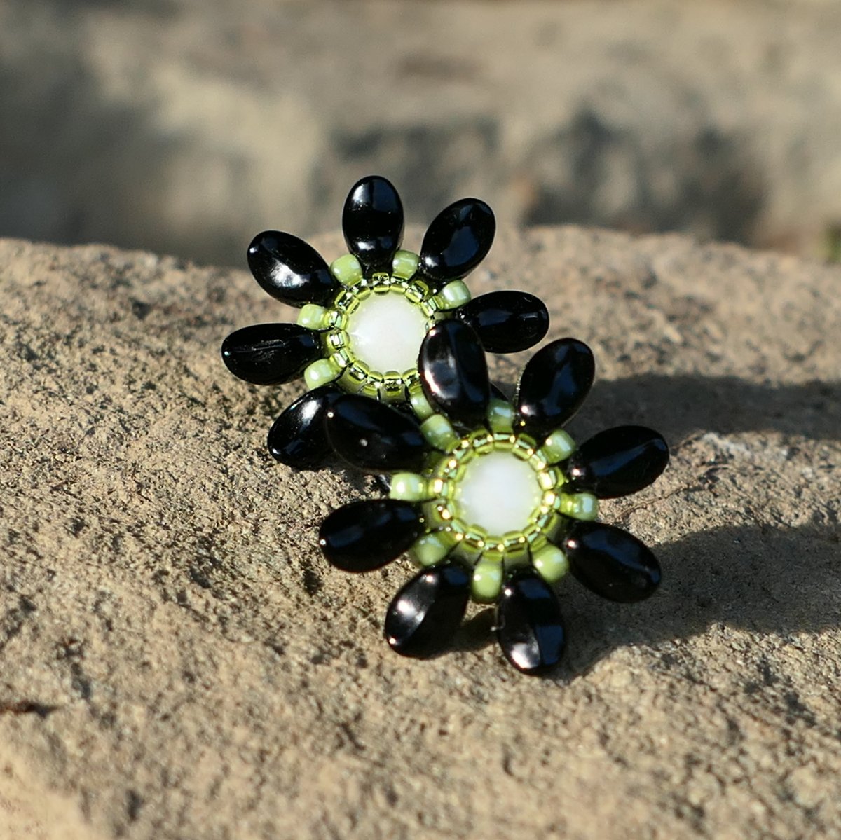 Mačkané skleněné korálky s japonským rokailem Toho v zelené a žlutozelené barvě, uprostřed skleněný kabošonek v křídově bílé barvě.