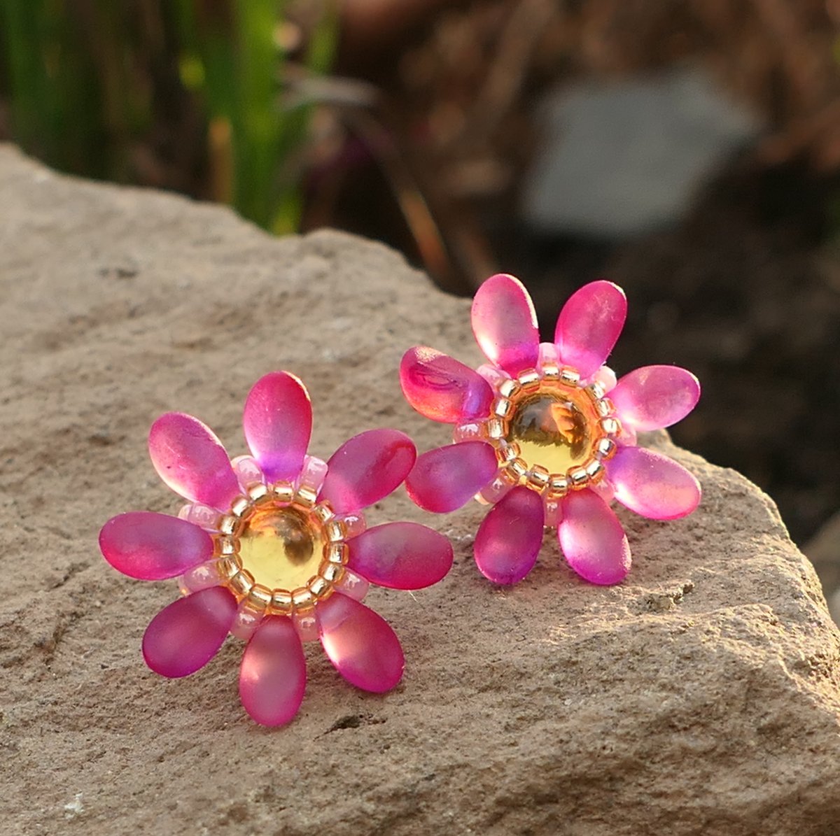 Mačkané skleněné korálky s japonským rokailem Toho v růžové a zlaté barvě, uprostřed skleněný kabošonek v průzračné světle žluté barvě.