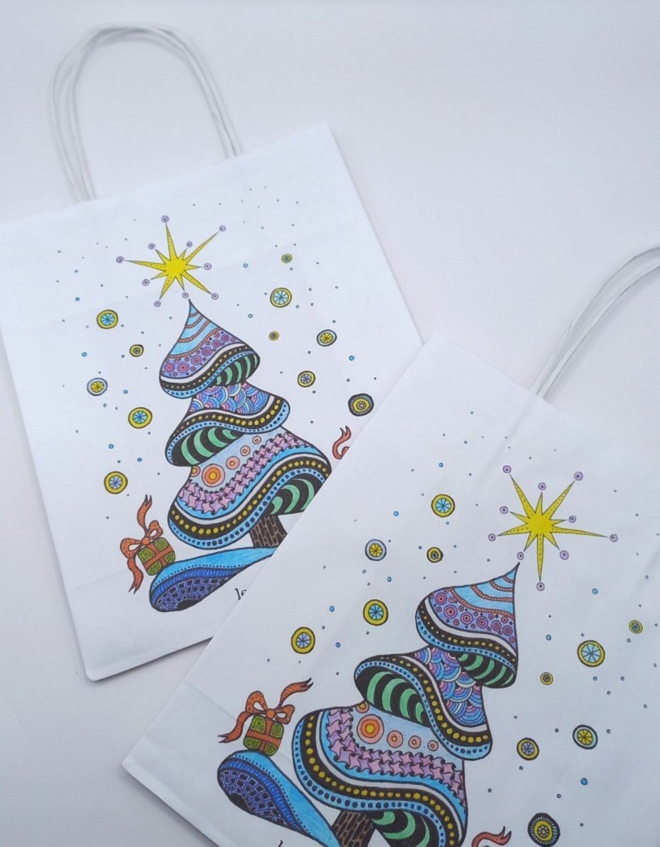 Elegantní bílá papírová taška s reprodukcí originálního motivu vánočního stromku, vytvořeným technikou zen-art.