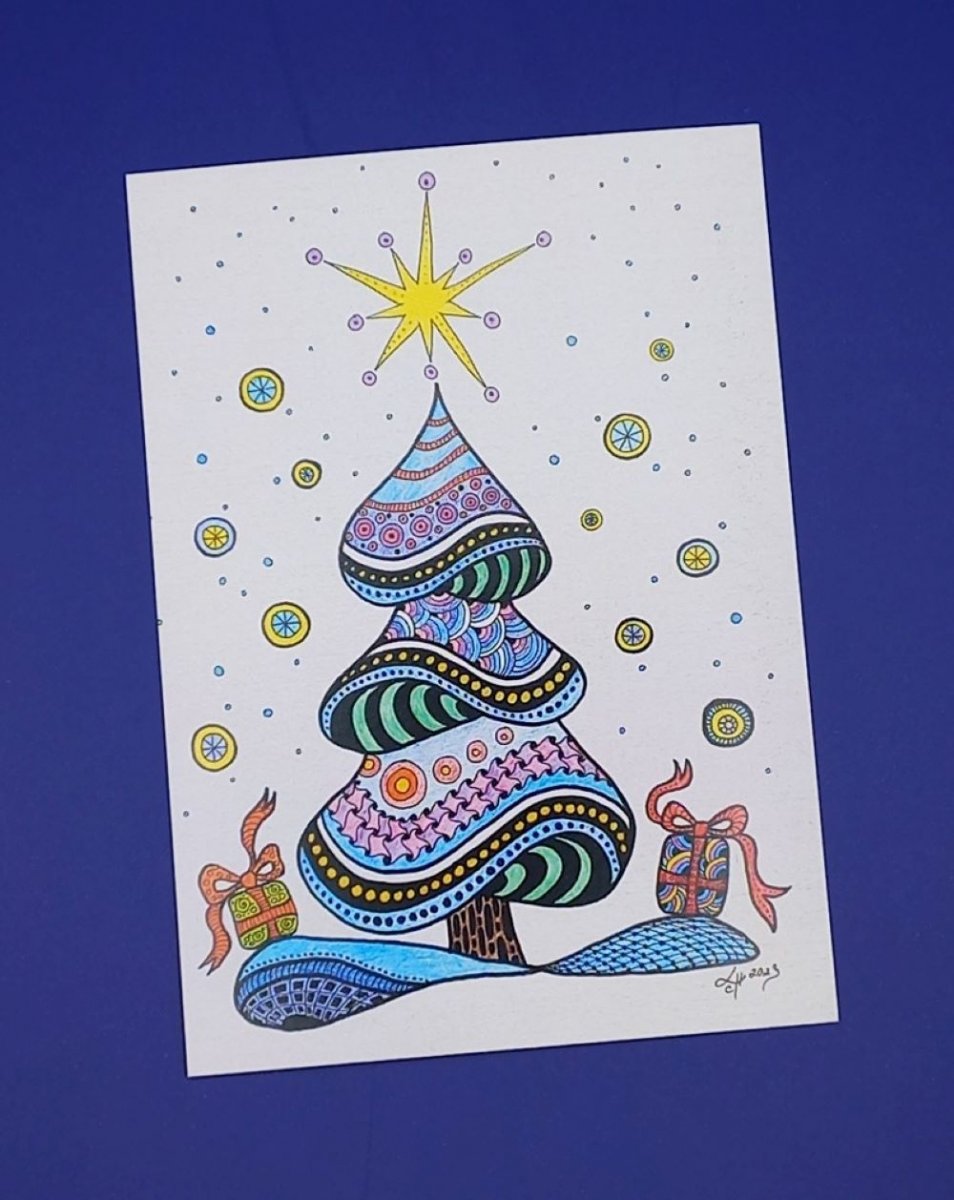 Originální pohlednice s jedinečným motivem vánočního stromku, vytvořeným technikou zen-art v kombinaci s jemnými pastelkami.
