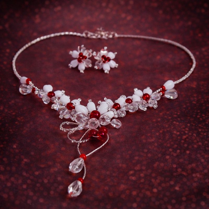 ručně vyráběné šperky, perličkový náhrdelník, elegantní šperky, šperkový set, náhrdelník s perličkami, společenské šperky, náušnice pecky, luxusní šperky, originální šperky, Autorské šperky, autorský šperk, ručně vyráběný náhrdelník, rudý náhrdelník, červené šperky, květinový náhrdelník, svatební šperky, náhrdelník s náušnicemi, originální šperk, šperky na ples, luxusní bižuterie, květinové šperky