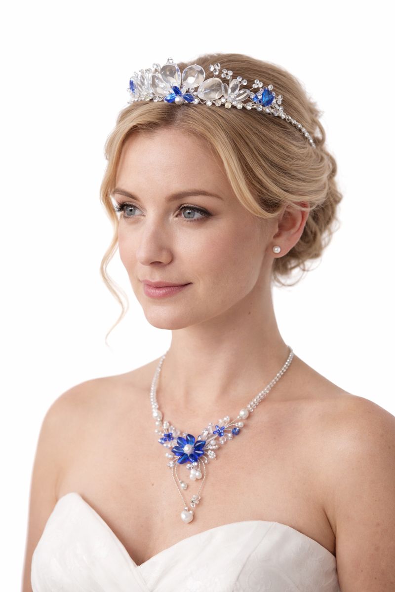 Každý kus je originál, vyráběný s důrazem na detail, lehkost a pohodlí při nošení. Díky harmonickému spojení bílé, stříbrné a královsky modré barvy je ideální volbou pro nevěsty, slavnostní příležitosti i společenské šaty v modrých či neutrálních tónech.