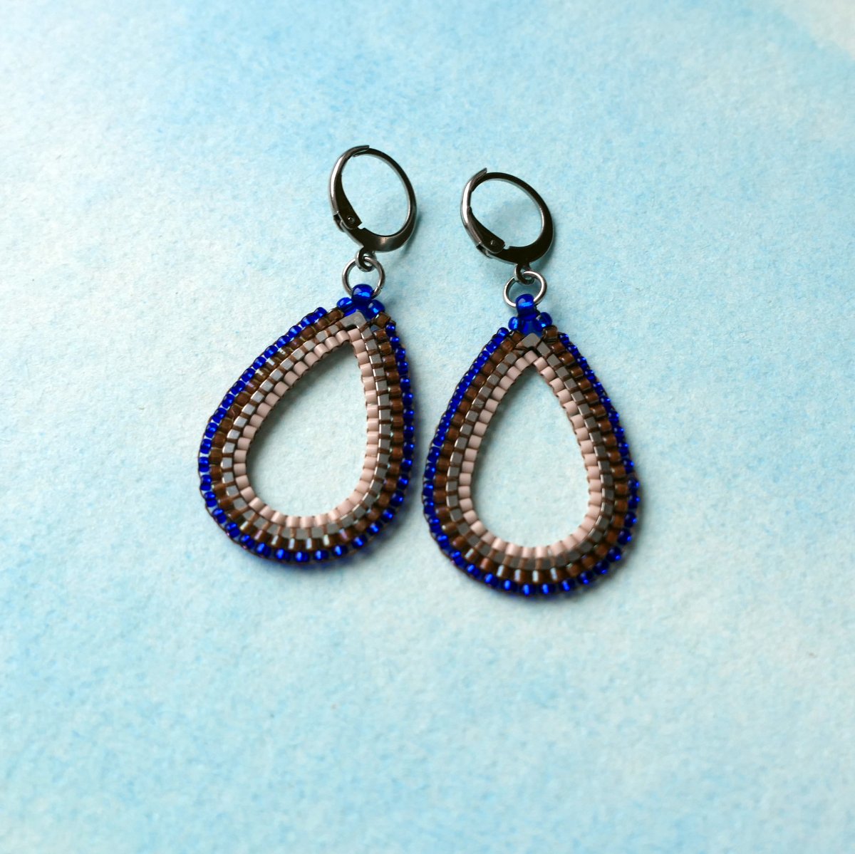 Ušito z japonského rokailu Miyuki různé velikosti a tvaru v barvě hnědé, pudrové a královsky modré.