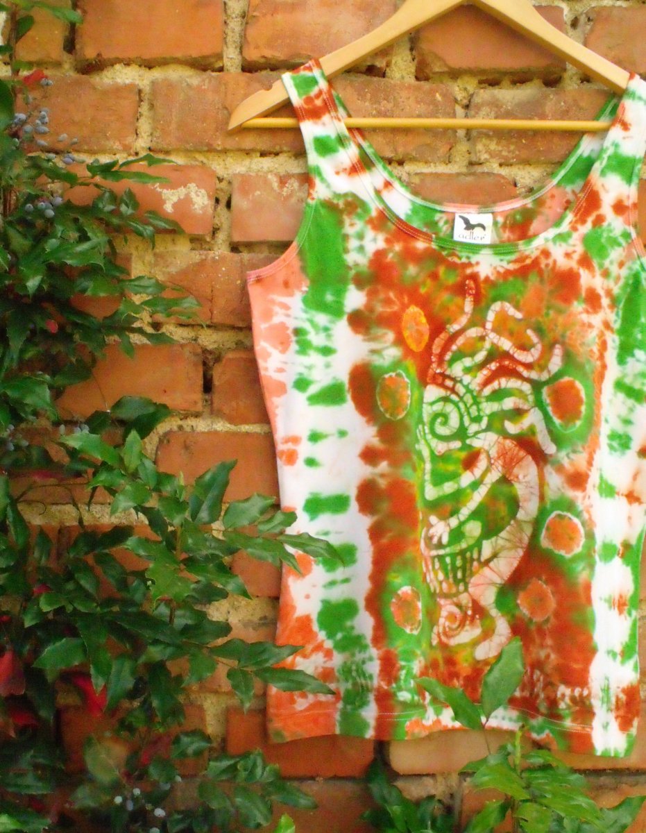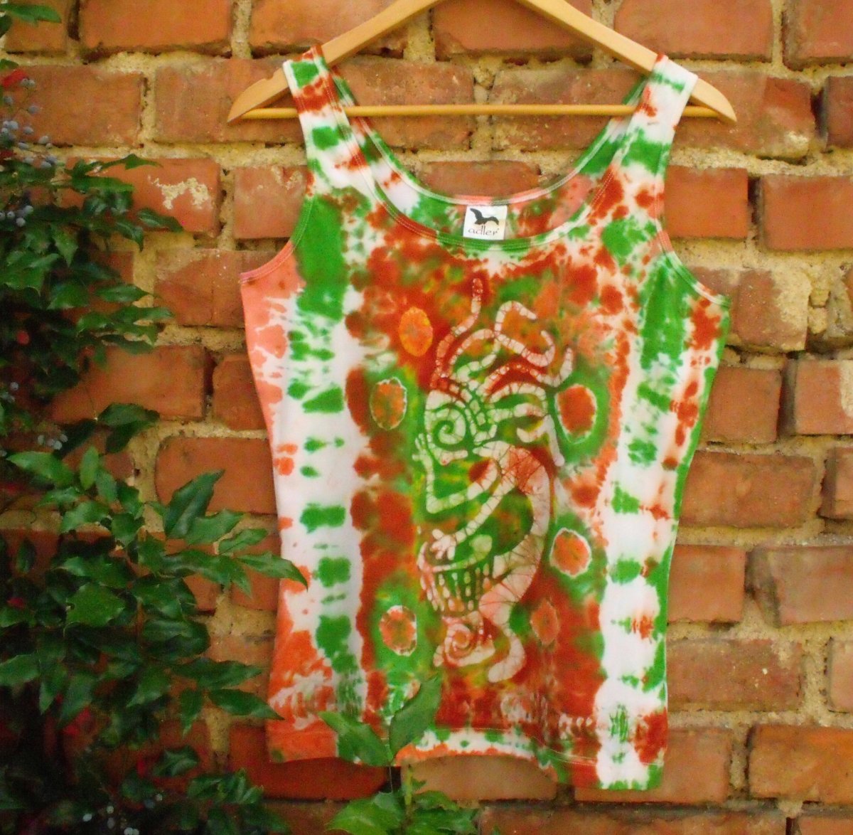 Originální malba na přední straně trička je vytvořena voskovou batikou (malba rozehřátým voskem) s použitím reaktivních barev na batiku za studena (oranžová, zelená, hnědá). Obrázek je dokreslen voskovkami na textil.