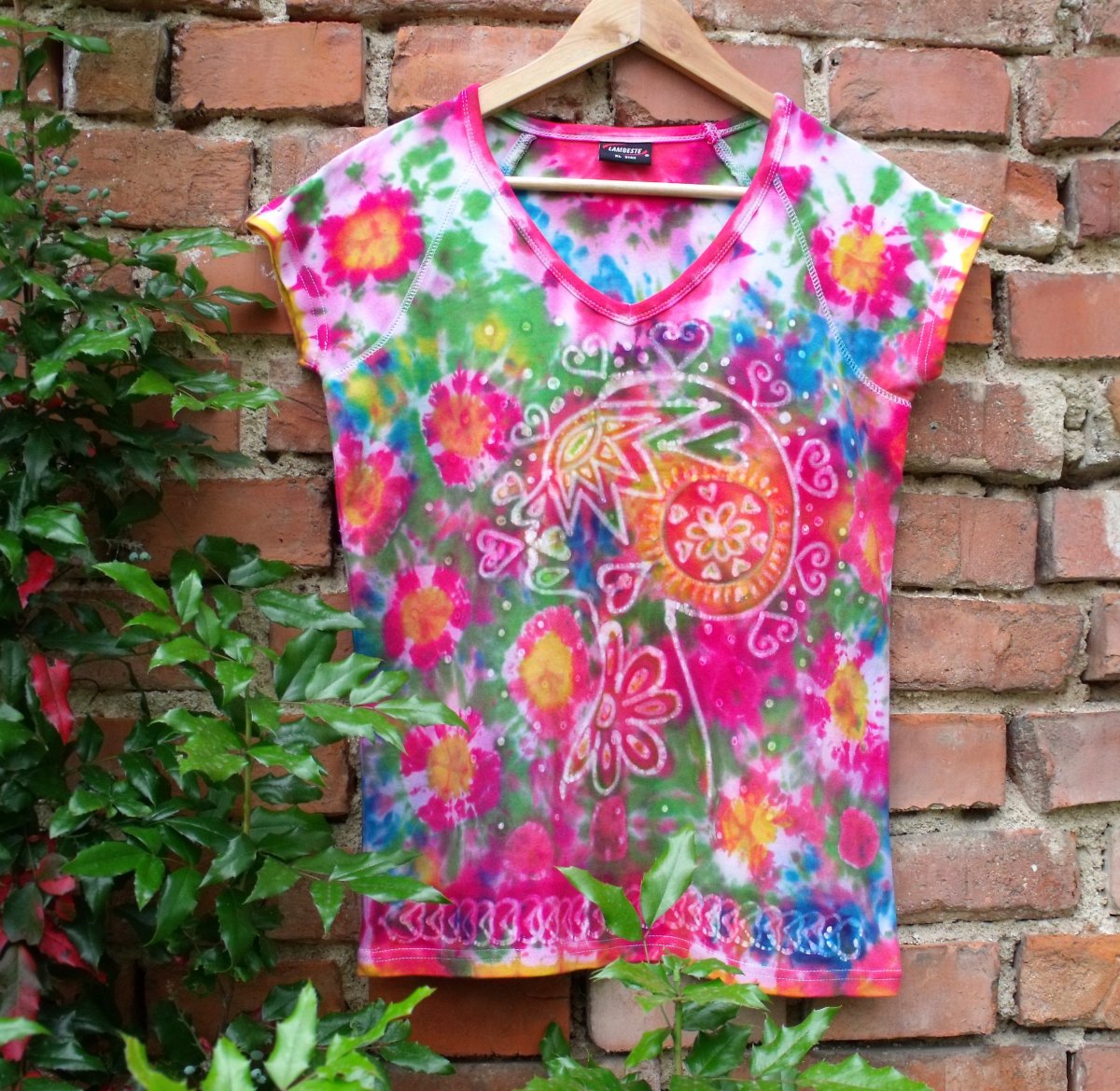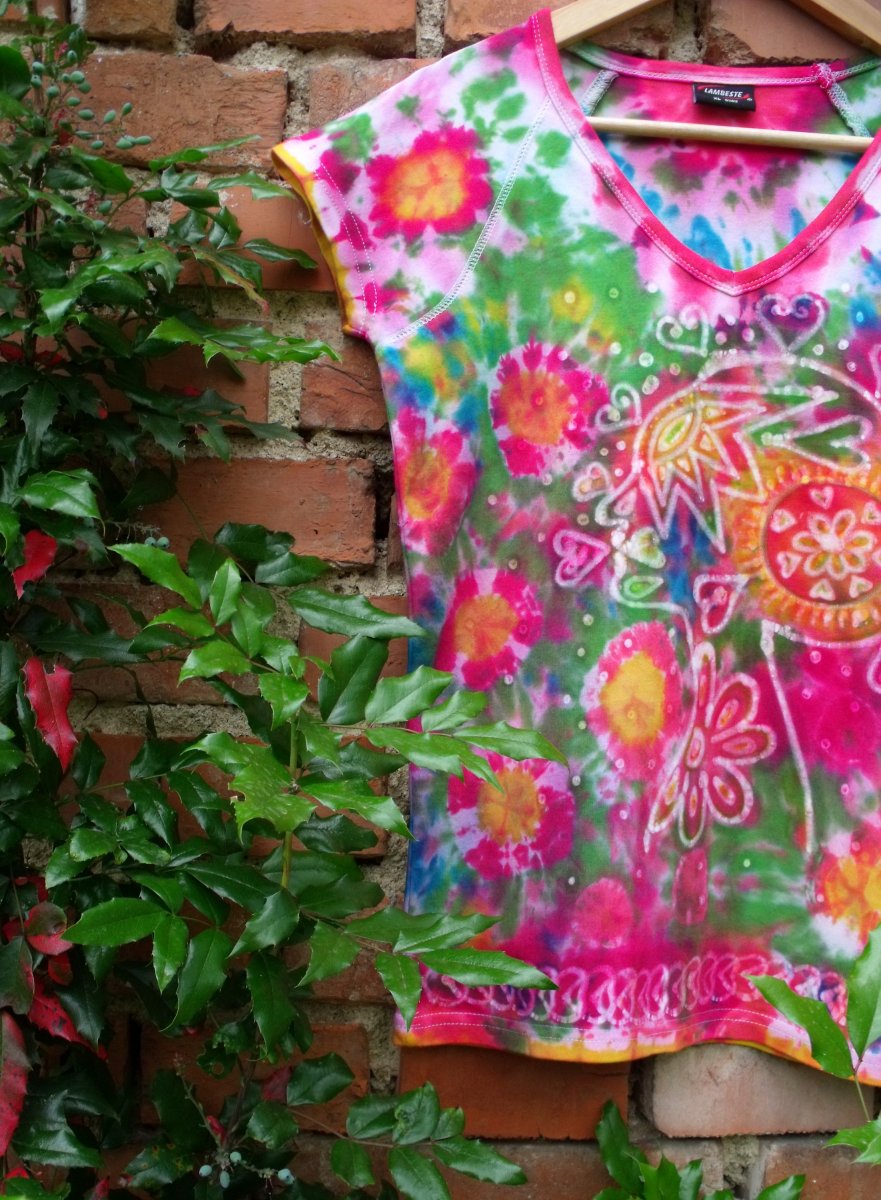 Originální malba na přední straně trička je vytvořena voskovou batikou (malba rozehřátým voskem) s použitím reaktivních barev na batiku za studena (žlutá, oranžová, růžová, zelená, modrá). Obrázek je dokreslen voskovkami na textil.