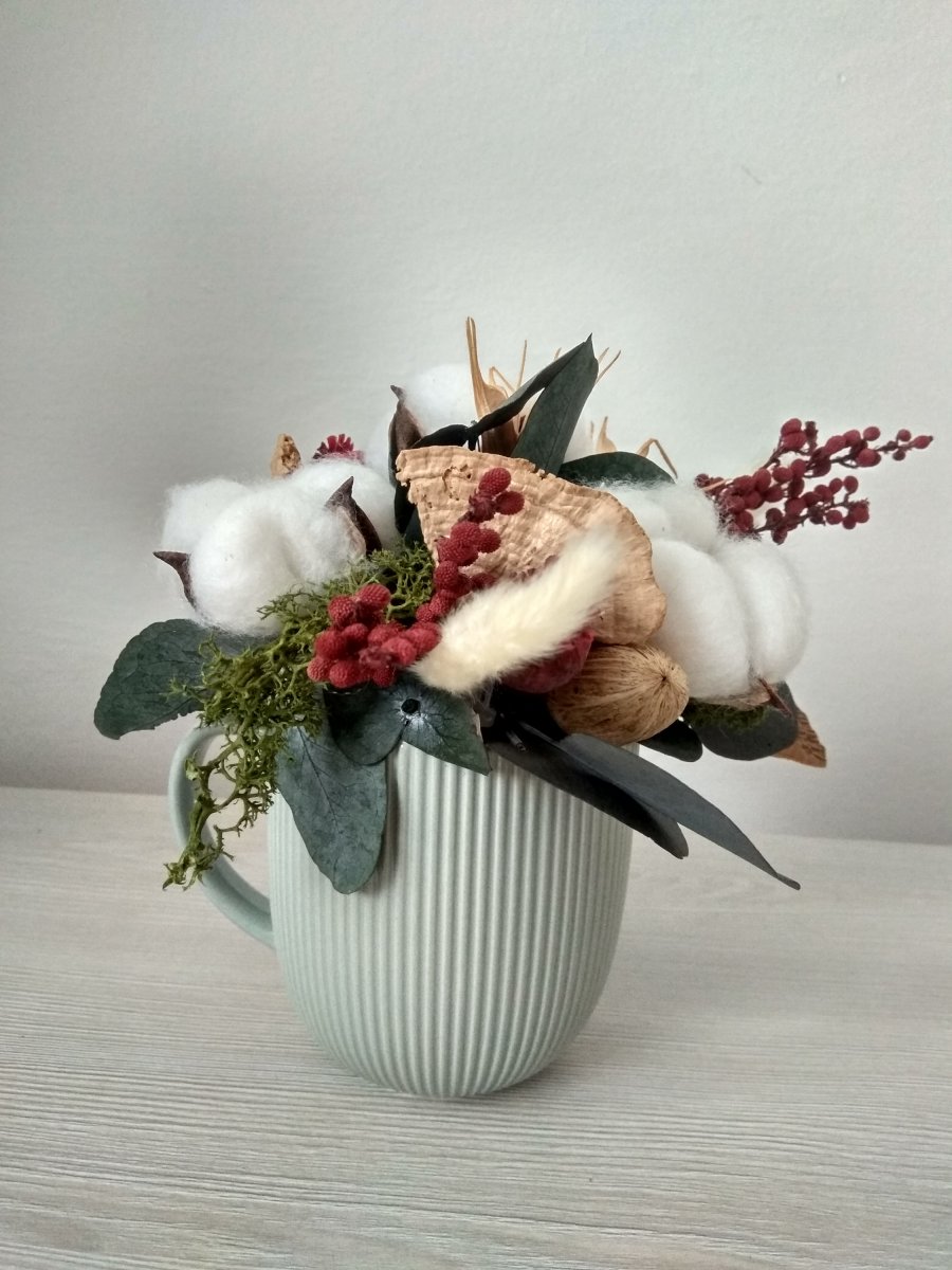 Vypichované aranžmá v hrnečku ze sušených rostlin. Přibližné rozměry: šířka 14 cm, výška 18 cm.