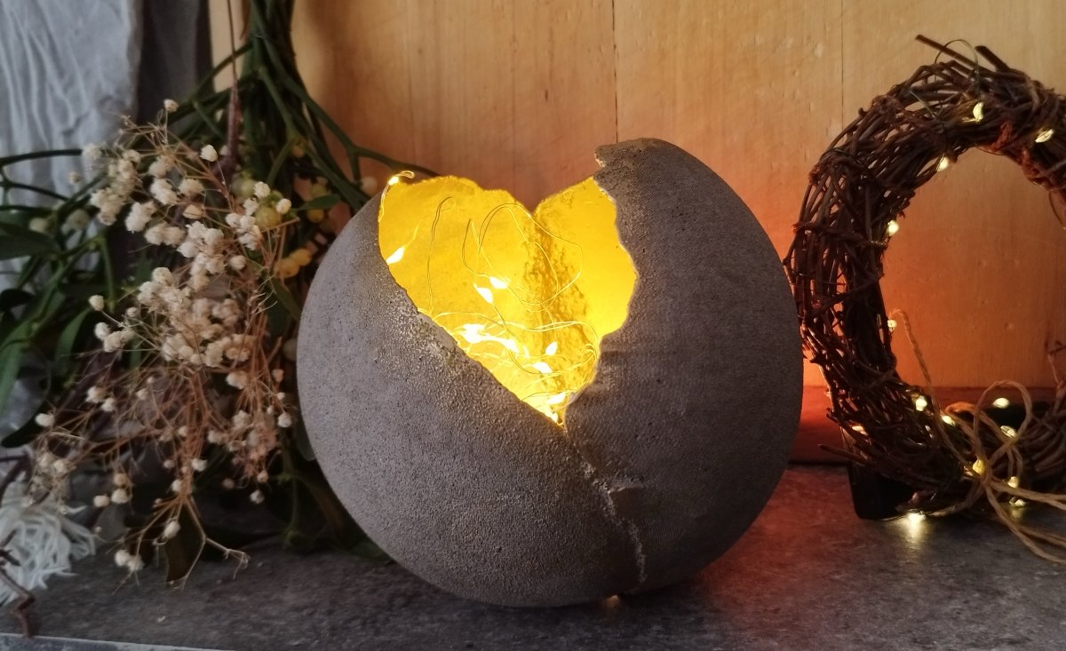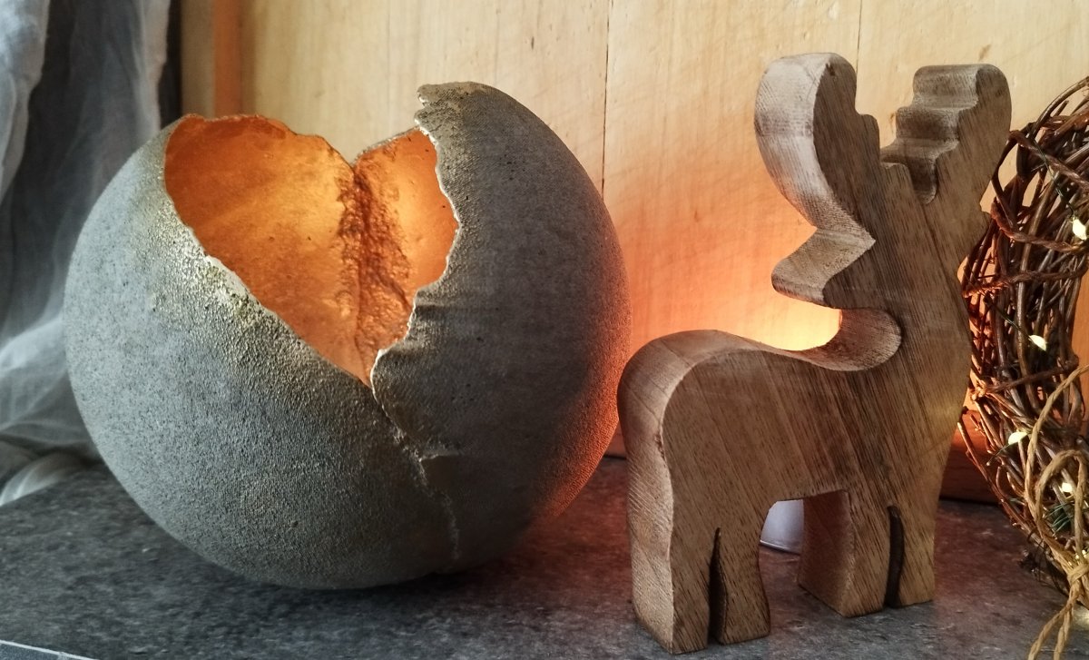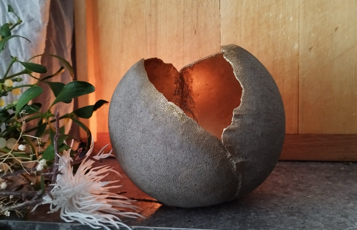 Betonový svícen mušle je v přirozené barvě betonu, přiznané spoje a vnitřek je nepravidelně zvýrazněn zlatou barvou.