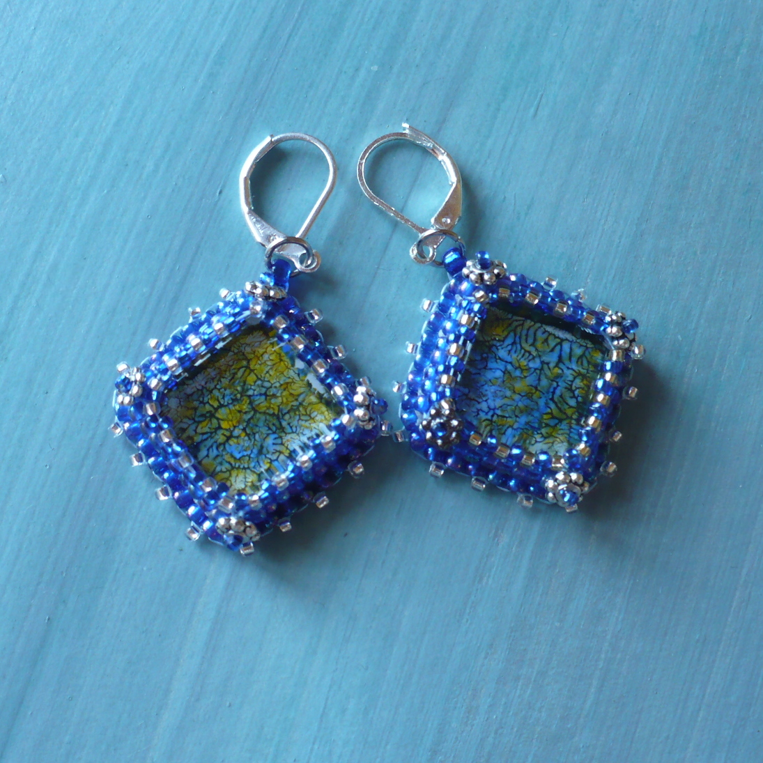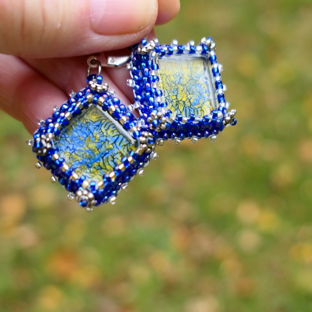 Šité náušnice s mačkaným sklem v barvě královsky modré a žluté. Kabošonky z mačkaného skla ručně malované. Jsou obšité japonským rokailem TOHO v barvě kobaltově modré a stříbrné. Dozdobeno kovovými korálky v rozích. Podšito modrou alcantarou.
