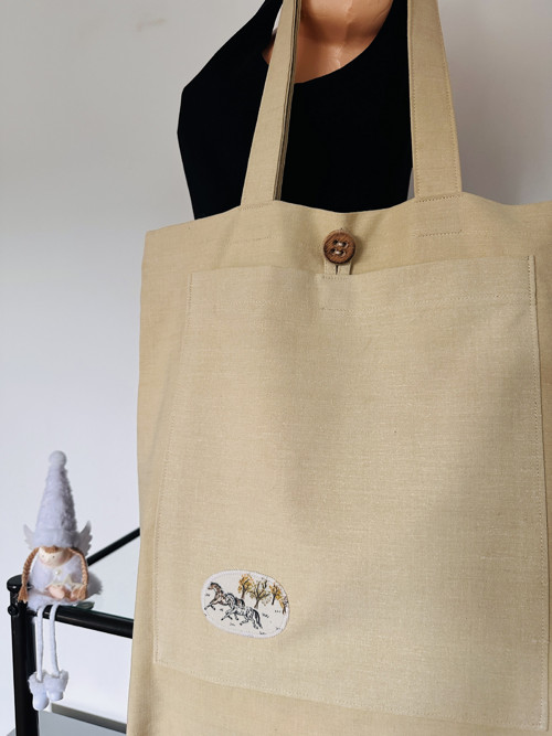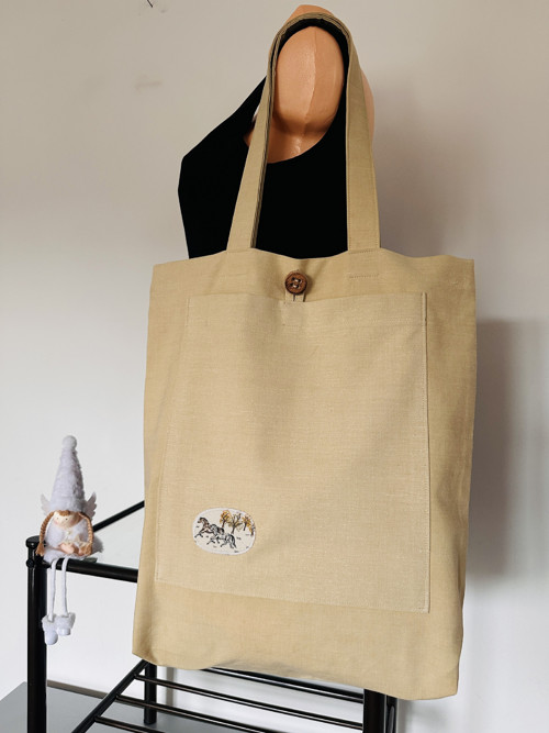 plátěná taška, je ušitá ze strašího materiálu, zdobená koníkama, má větší kapsu na kapesníky, časopis, dokumenty, délka od ramene 75 cm, šíře 40 cm, délka 44 cm.
