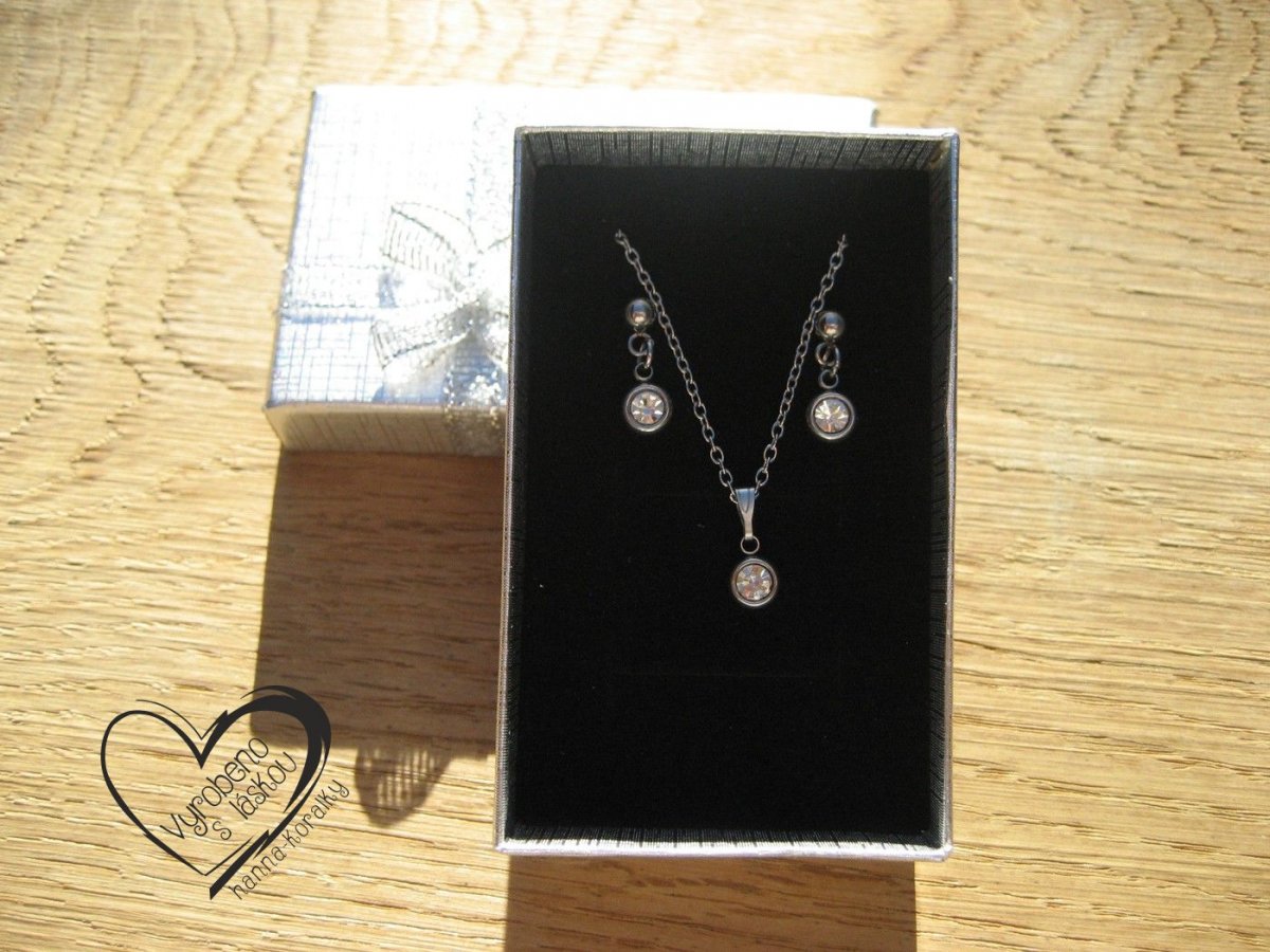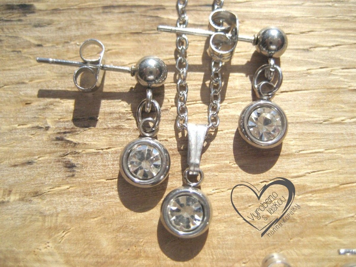 Jemná, jednoduchá a přitom elegantní sada řetízku a náušnic z nerez oceli s bílým skleněným korálkem, délka řetízku 45 cm, průměr přívěsku 5 mm