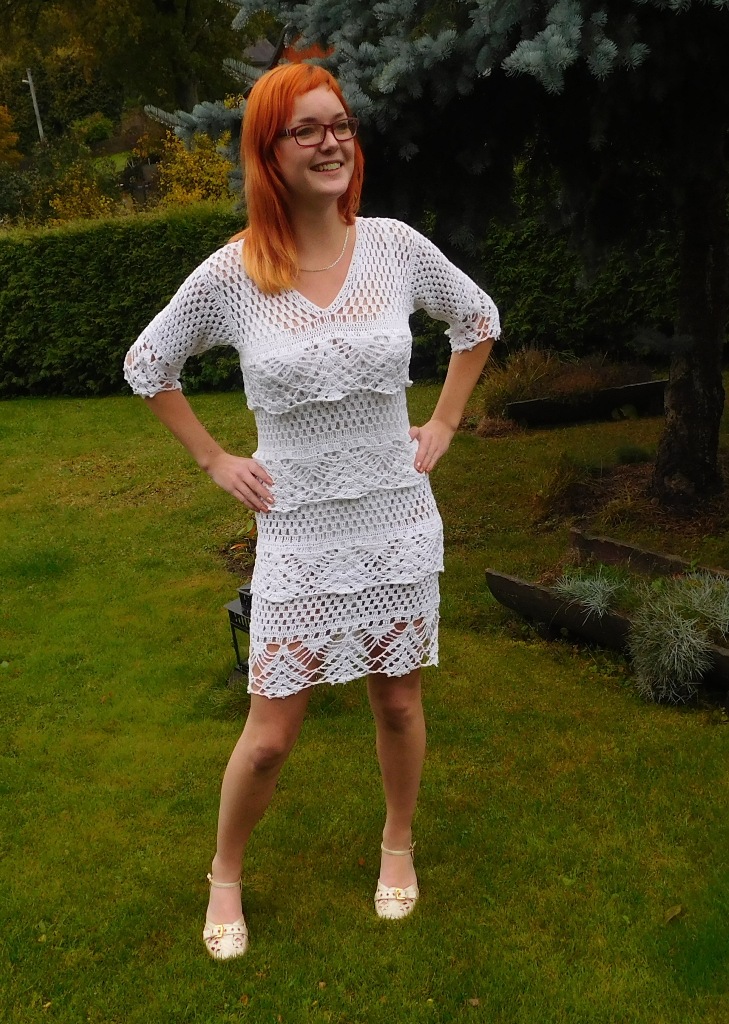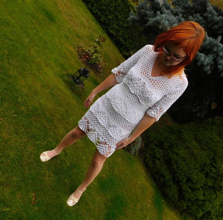 Bílé háčkované šaty, s krátkým rukávem. Šaty jsou uháčkované z bavlněné příze. Šaty jsou pružné a přizpůsobí se postavě. Doporučuji velikost 36 do max.40. Je potřeba počítat s tím, že když se šaty natáhnou do šířky, budete je mít kratší. Dají se nosit i jako tunika třeba k legínám nebo úzkým riflím.