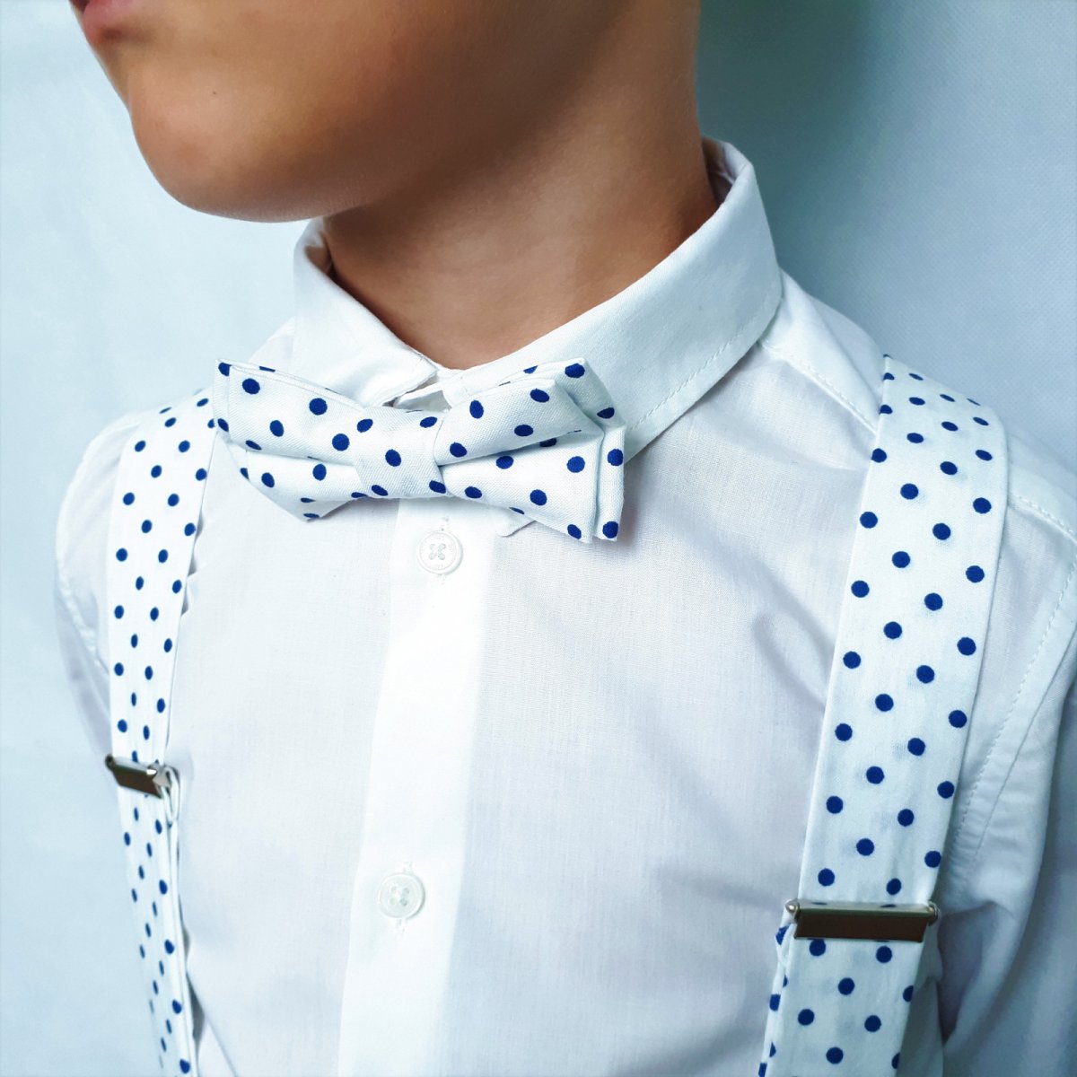 Pánsky set motýlik, traky a vreckovka do saka v elegantnom bielom prevedení s modrými bodkami, ktorý dokonale oživí Váš outfit a zvýrazní vašu osobnosť. Polka dots bodky sú hitom tohtoročnej sezóny! Ak Vám chýbajú polka bodky v bielomodrom prevedení, potom si jednoducho musíte zaobstarať tento skvelý model do Vašej motýlikovej kolekcie.
